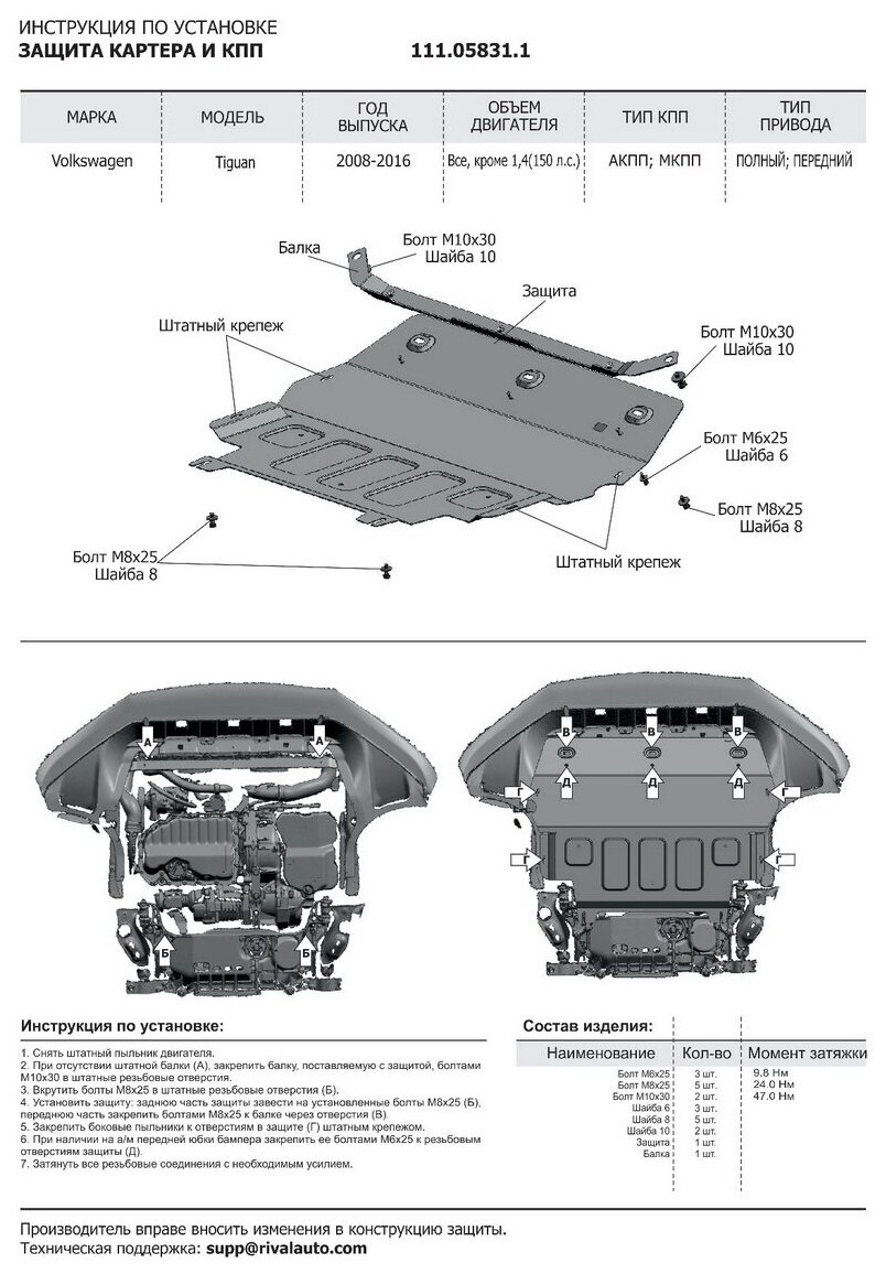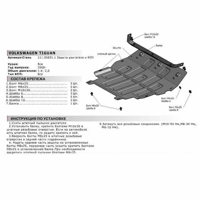 Защита картера и КПП Автоброня Volkswagen Tiguan, V - 1,4; 2,0 2008-2011 2011-2016, сталь 2 мм., комплект крепежа, .