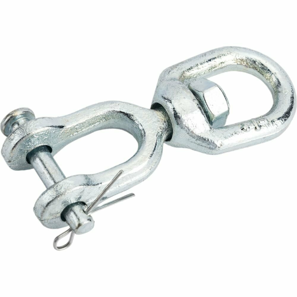 Вертлюг изготовлен из оцинкованной углеродистой стали и предназначен как соединительное звено между двумя тросами, цепями, позволяющее каждому из них вращаться вокруг своей оси, защищая их от скручивания.