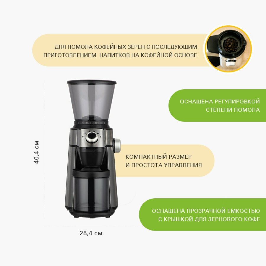 Кофемолка Viatto предназначена для равномерного помола и дозировки порций молотого кофе.Благодаря компактным размерам и простоте управления подходит для небольших кофеен, магазинов, а также для домашнего использования.Оснащена прозрачной емкостью с крышкой для зернового кофе.ХарактеристикиБункер для зерен 350 г;Контейнер для молотого кофе 150 г;Регулировка степени помола;Корпус из пластика с облицовкой из нержавеющей стали;Бункеры для зерен и молотого кофе – из пластика