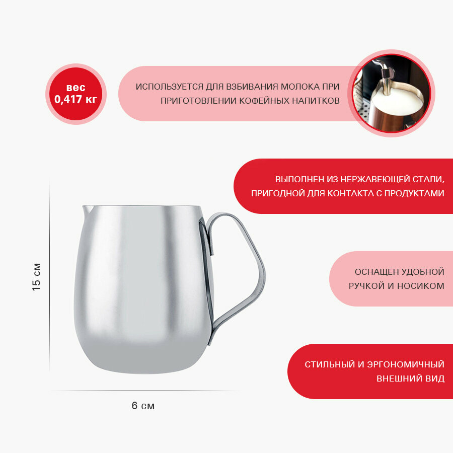 Молочник предназначен для взбивания молока или горячего шоколада. Специальная форма корпуса способствует равномерному распределению температуры во время взбивания и созданию плотной, равномерной и нежной молочной пенки. Эргономичная форма с аккуратным носиком обеспечивает контролируемый и точный розлив.