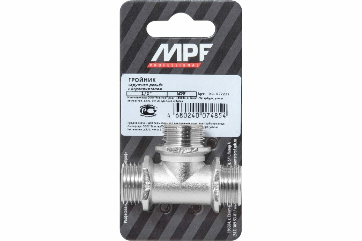 Тройник 1/2" с ограничителем MasterProf служит для разветвления потоков трубопровода под прямым углом в системах холодного и горячего водоснабжения и отопления. Благодаря наличию ограничителя на наружной резьбе данного фитинга создается дополнительное препятствие смещению и выдавливанию уплотнительных материалов при закручивании резьбы. Для облегчения процесса монтажа на бортике наружной резьбы имеется площадка под гаечный или разводной ключ.