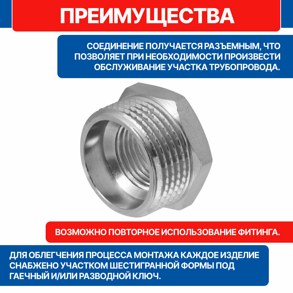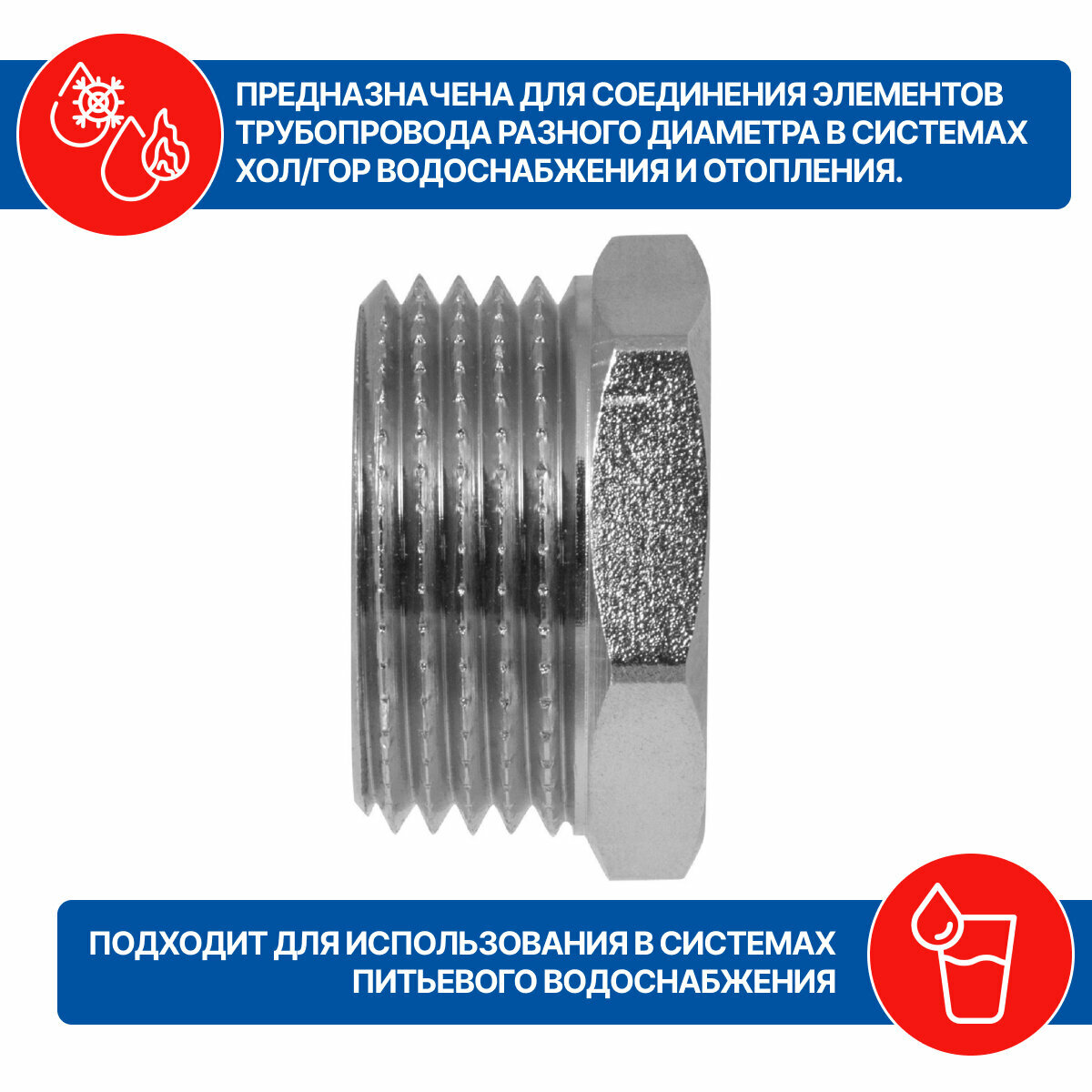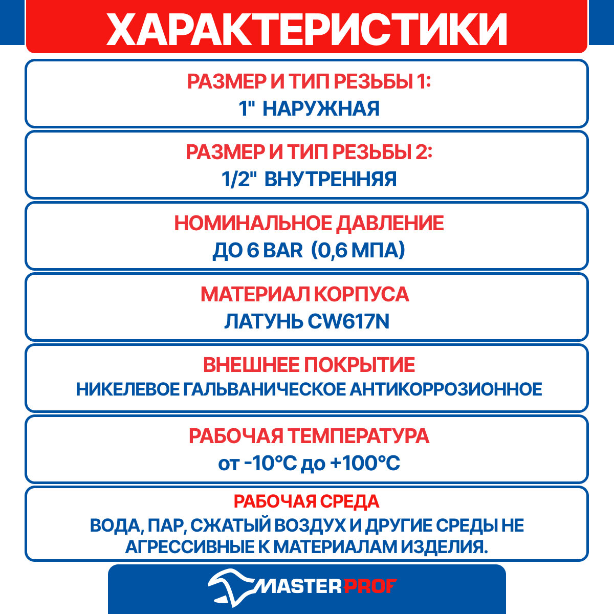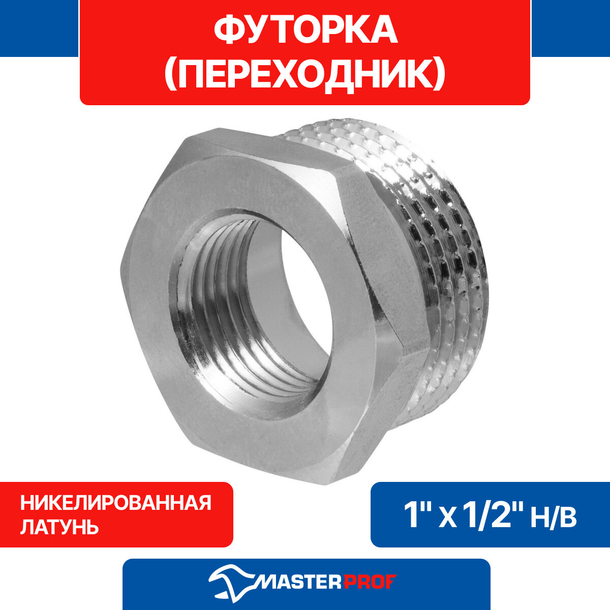 Футорка переходник 1"х1/2" MasterProf предназначена для соединения элементов трубопровода в системах холодного и горячего водоснабжения и отопления. Для облегчения процесса монтажа каждое изделие снабжено участком шестигранной формы под гаечный или разводной ключ.