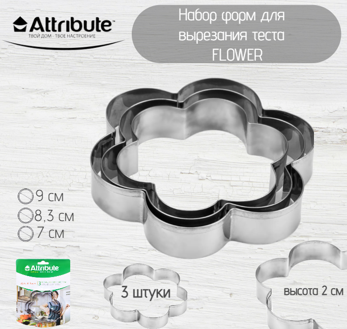 Набор Attribute Flower состоит из 3 форм в виде цветка для вырезания теста, выполненных из нержавеющей стали. Формы можно использовать для создания печенья, сладких украшений, бутербродов, как трафарет для украшений из бумаги и других материалов.