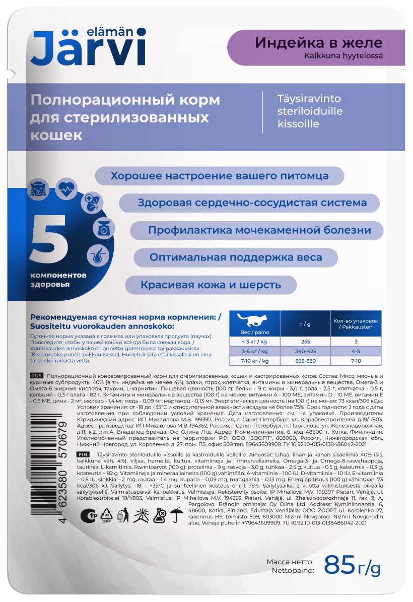 Jarvi (Ярви) - это полнорационный влажный корм, соответствующий высоким стандартам финского качества и производимый на российско-голландском заводе.Кастрированные коты и стерилизованные кошки нуждаются в особом рационе и заботе о здоровье мочевыделительной системы. Паучи Ярви являются отличным выбором питания для кошек, ведь их составы разработаны с учётом потребностей всех категорий питомцев. Высокий процент мяса в составе даёт необходимую норму белка.Корм является полнорационным, а значит, обеспечивает животное всеми необходимыми веществами, витаминами и микроэлементами и не требует каких-то дополнительных добавок в питании.