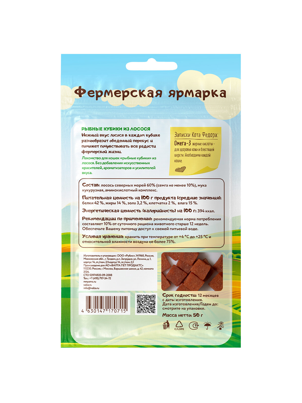 Мнямс Фермерская Ярмарка лакомство для кошек рыбные кубики (Лосось 50 г.)