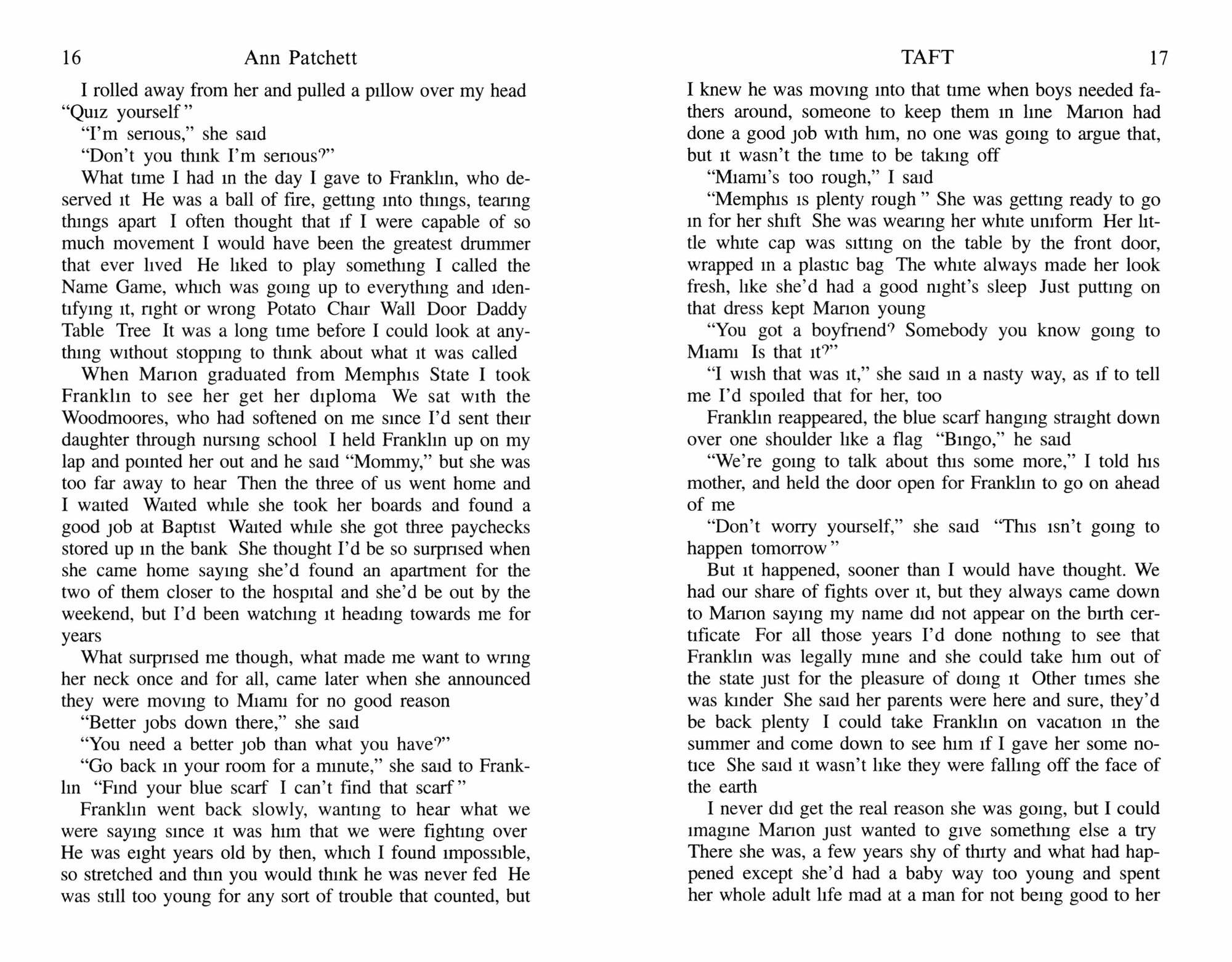But Nickel finds himself consumed with the idea of Taft, Fay and Carl's dead father, and begins to reconstruct the life of a man he never met but whose place he has taken.