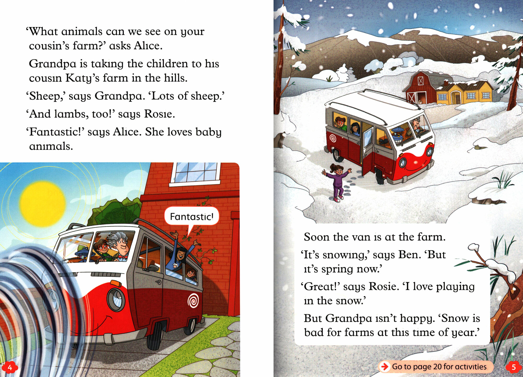 Ben, Rosie, and Alice are at Aunt Katy's farm. It's snowing, and some sheep are up on the hills. How can the children help?