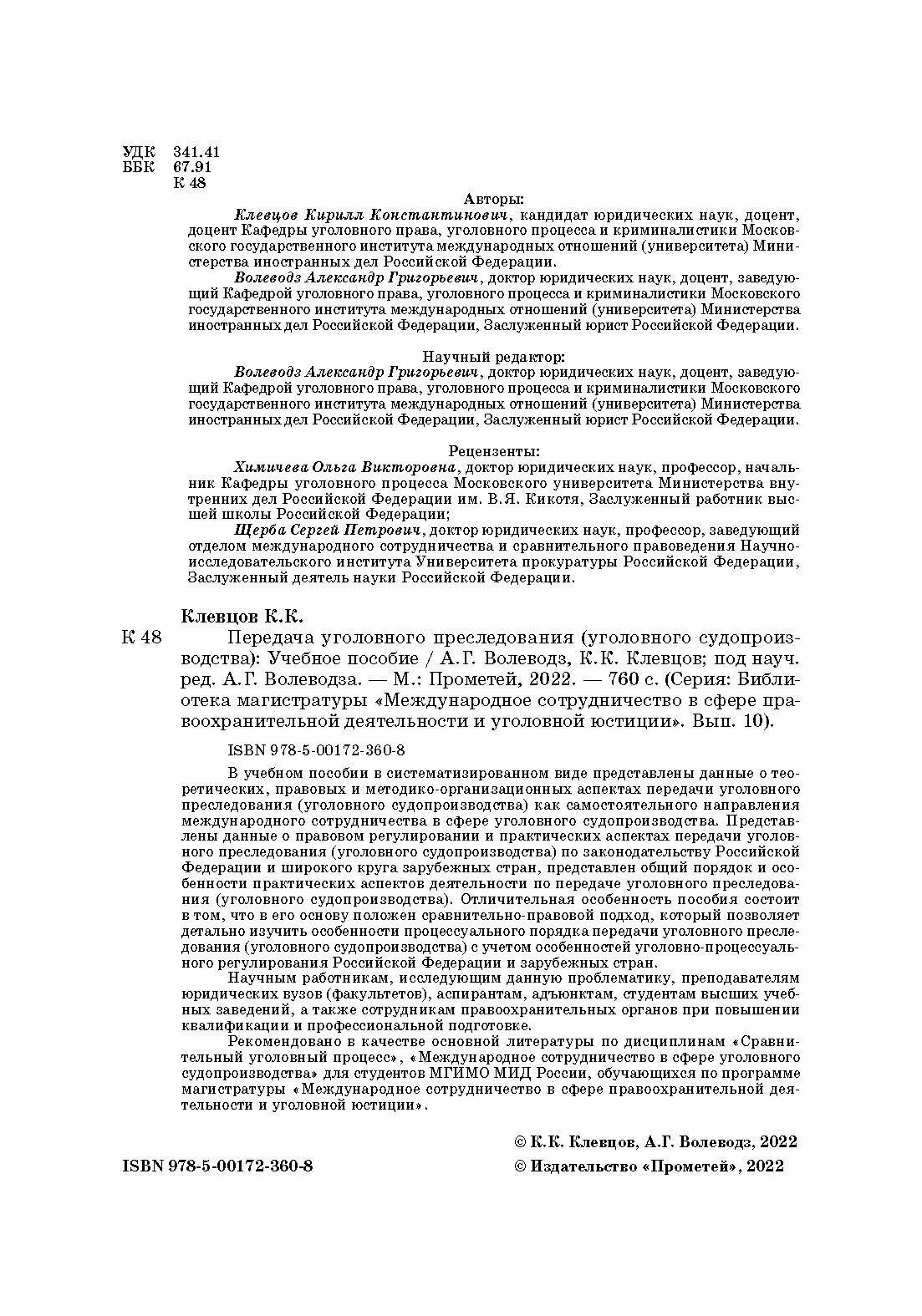 Передача уголовного преследования (уголовного судопроизводства). Учебное пособие (Волеводз Александр Григорьевич; Клевцов Кирилл Константинович); Прометей, 2022