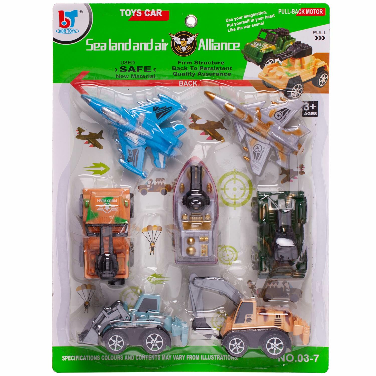Состав набора: танк - 1 шт., военный джип - 1 шт., морской катер - 1 шт., самолет-истребитель - 2 шт., трактор - 1шт., экскаватор - 1 шт.