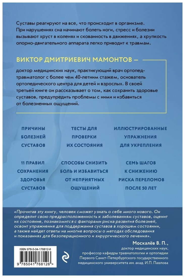"Человек, прочитавший эту книгу, узнает о себе много нового. Он определит, предрасположен ли он или нет к заболеваниям суставов, проведя простые тесты, оценит состояние своих суставов, познакомится с факторами риска развития болезней, освоит упражнения для поддержания всех суставов в хорошем состоянии, а также найдет ответы на вопросы о методах обследования и показаниях для безоперационного и хирургического лечения суставов". - Москалёв В. П., доктор медицинских наук, профессор кафедры травматологии и ортопедии Первого Санкт-Петербургского государственного медицинского университета им. акад. И.П. Павлова