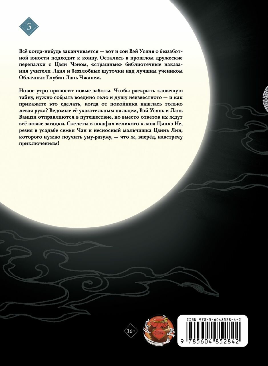 Сон Вэй Усяня о беззаботной юности подходит к концу. Остались в прошлом дружеские перепалки с Цзян Чэном, «страшные» библиотечные наказания и беззлобные шуточки над Лань Чжанем. Новое утро приносит новые заботы. Чтобы раскрыть зловещую тайну, нужно собрать воедино тело и душу неизвестного — и как прикажете это сделать, когда от покойника нашлась только левая рука? Ведомые её указательным пальцем, Вэй Усянь и Лань Ванцзи отправляются в путешествие, но вместо ответов их ждут лишь новые загадки...