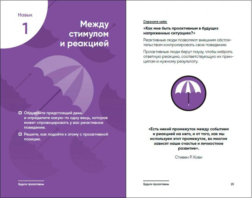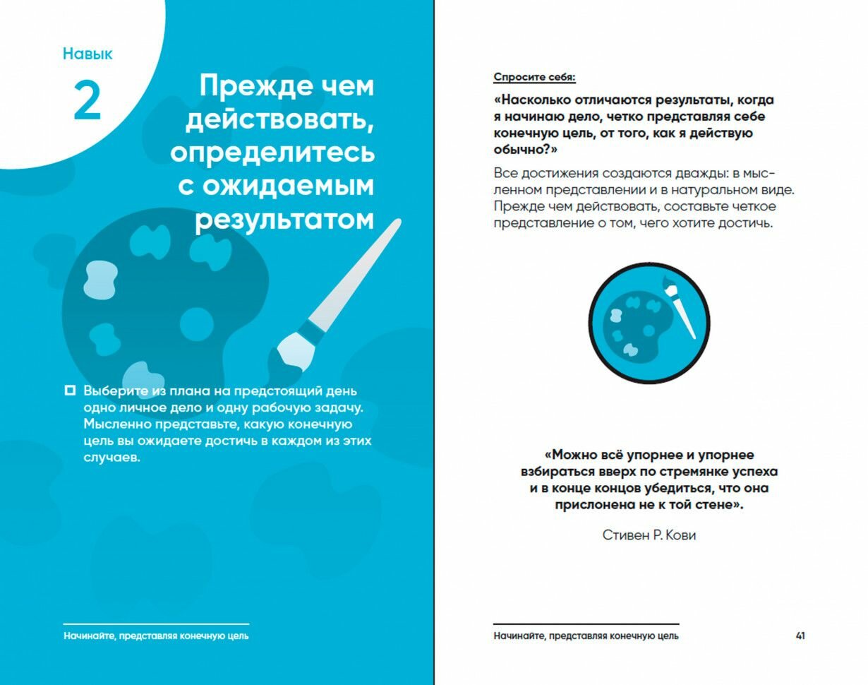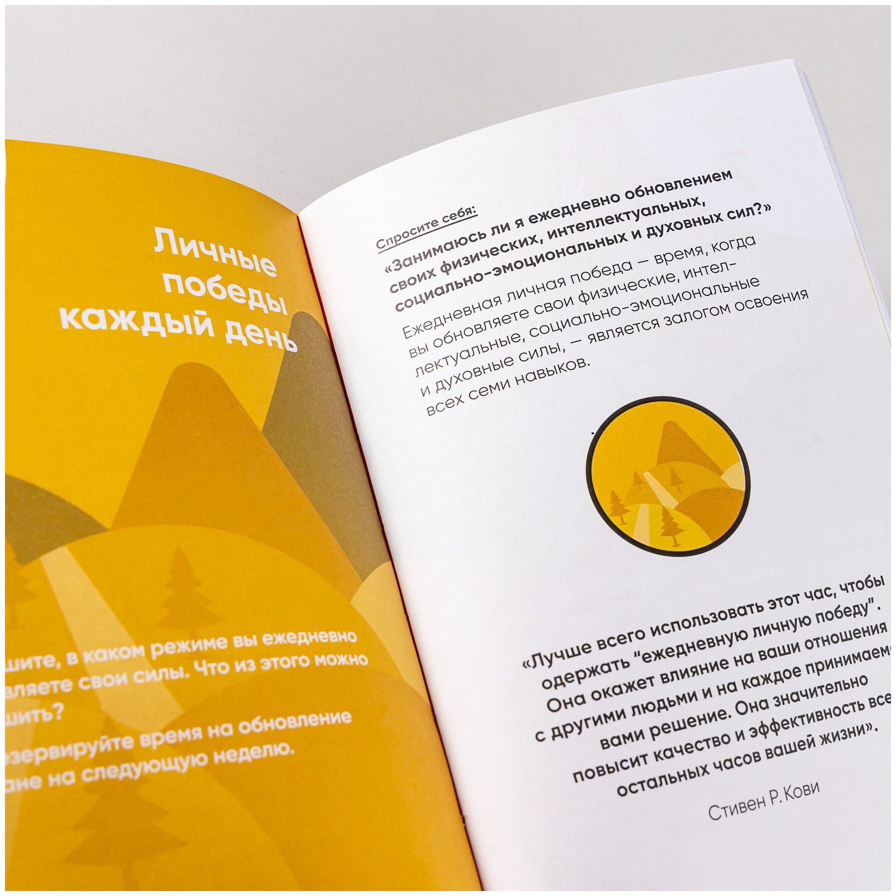 Очень приятная и познавательная книжка. Можно сказать, что по сути это дневник эффективности: тут есть чуть-чуть теории о том, что представляет собой и как звучит каждый навык, а потом даются советы по каждому из них, и все очень жизненные. Также предлагаются вопросы, которые надо задавать самому себе. Много информации, заставляющей задуматься, много мотивирующих цитат. Всё вместе это помогает задуматься над правильностью ежедневных действий и жизнью вообще. Понравилось, рекомендую к прочтению и практикованию)))