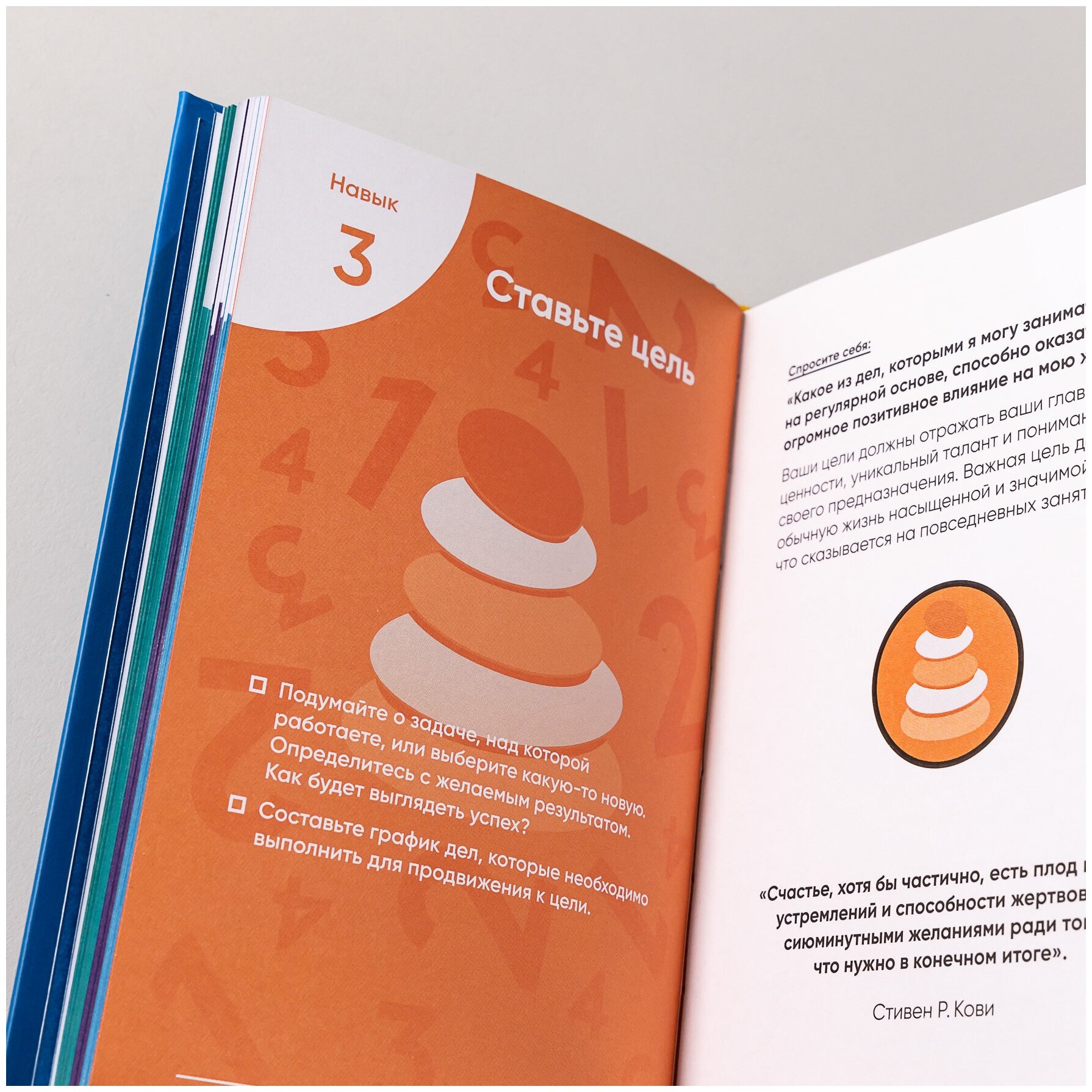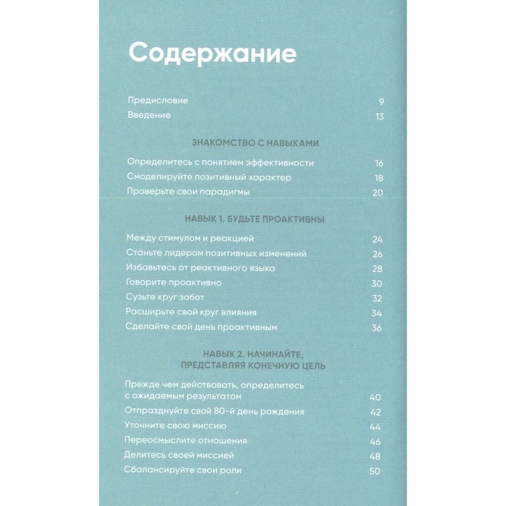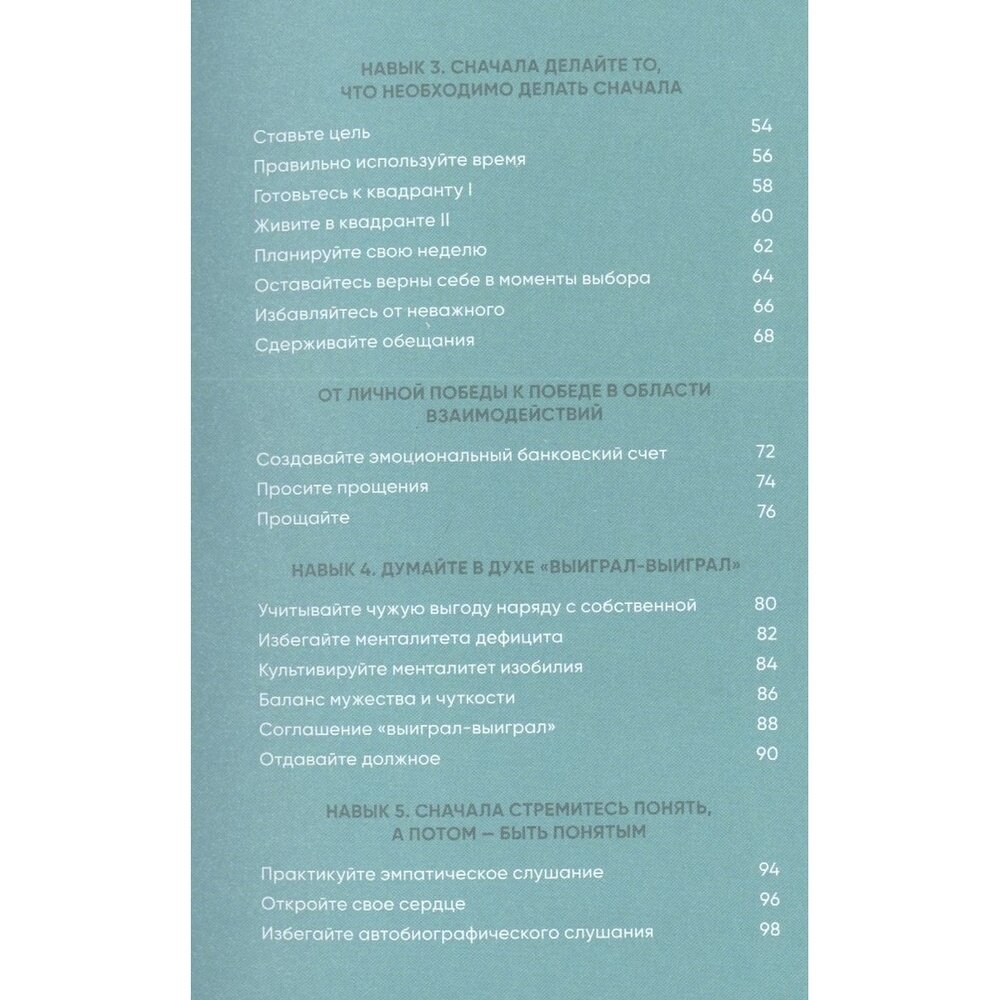 Очень приятная и познавательная книжка. Можно сказать, что по сути это дневник эффективности: тут есть чуть-чуть теории о том, что представляет собой и как звучит каждый навык, а потом даются советы по каждому из них, и все очень жизненные. Также предлагаются вопросы, которые надо задавать самому себе. Много информации, заставляющей задуматься, много мотивирующих цитат. Всё вместе это помогает задуматься над правильностью ежедневных действий и жизнью вообще. Понравилось, рекомендую к прочтению и практикованию)))