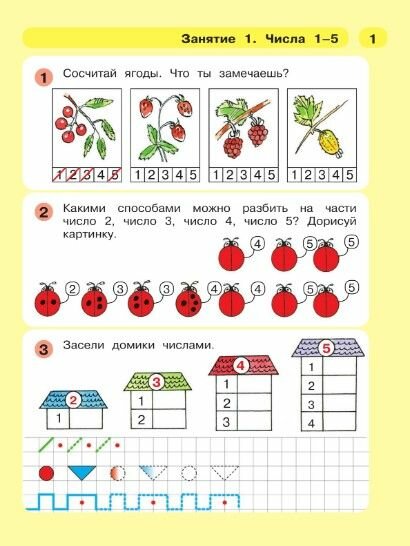 Продолжение рабочей тетради. С более сложными задачами и заданиями. Заниматься интересно, но трудновато. Не всё легко получается объяснить ребёнку. Для занятий в классе очень хороший вариант, разносторонняя подготовка ребенка к счёту и школьной математике: счёт с использованием костяшек домино, числовых отрезков и домиков, разноцветных фигур разной формы; простые примеры на сложение, вычитание и сравнение чисел. Также задания на повторение узора и продолжение последовательности.