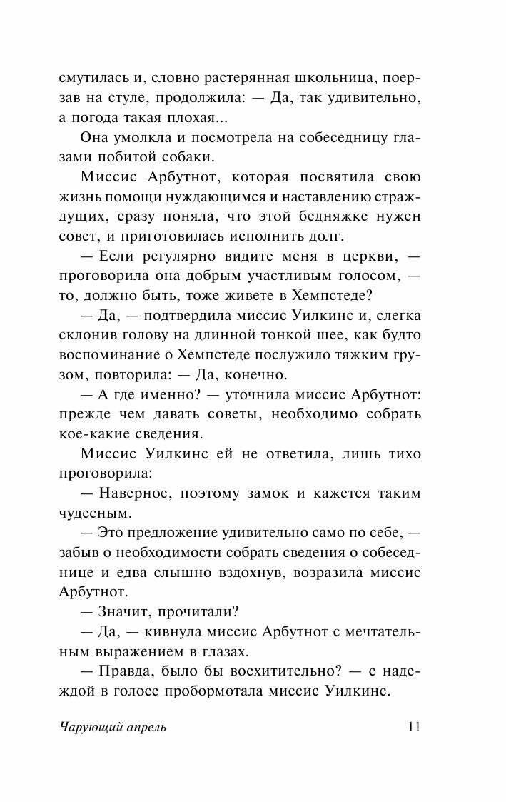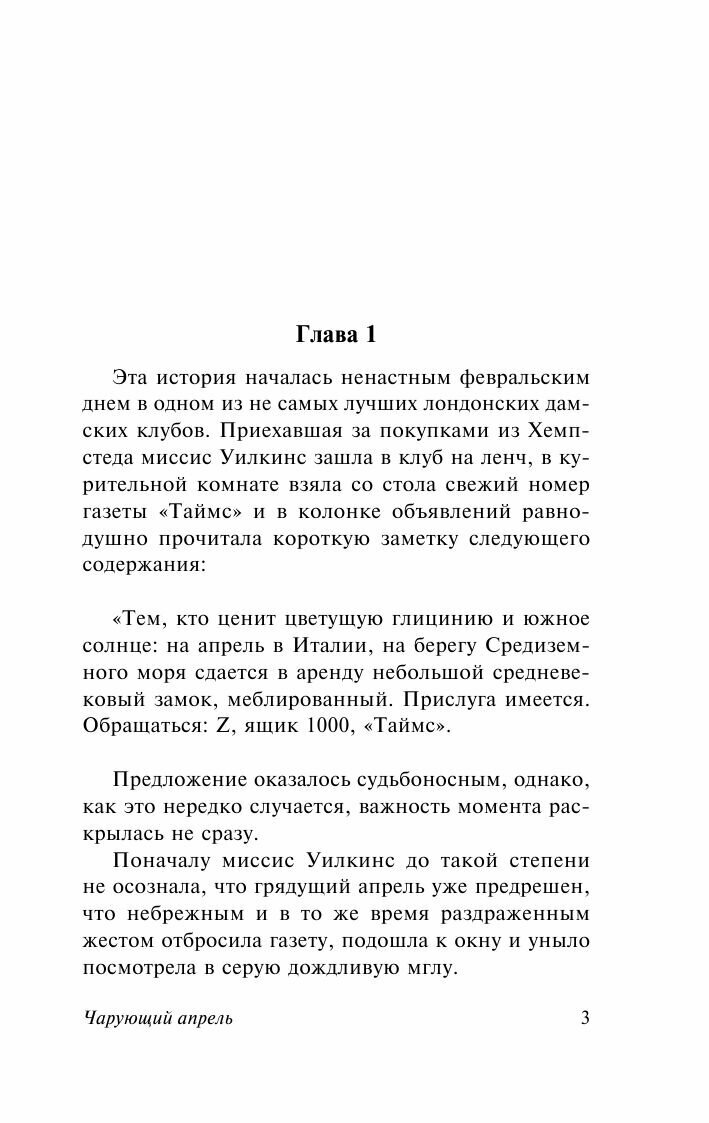 Чарующий апрель... Небольшой роман, который рассказывает читателю о том, как 4 разных женщины решили арендовать старинный замок, покинув привычный мир и устои. 4 обычные женщины, которые хотят побыть свободными от быта, мужей, друзей... Мне очень понравилась идея автора, что каждый рано или поздно должен посмотреть на свою жизнь со стороны и переосмыслить себя. Лёгкий слог, понятное написание, логичный сюжет и нежные романтичные линии... Подкупила меня и обложка с дамами от эксклюзивной классики - тоже захотелось в Италию на море... Книга очень простая и в тоже время полезная, зацепила и заинтересовала. К прочтению точно советую, а по оценке твёрдая 10/10.