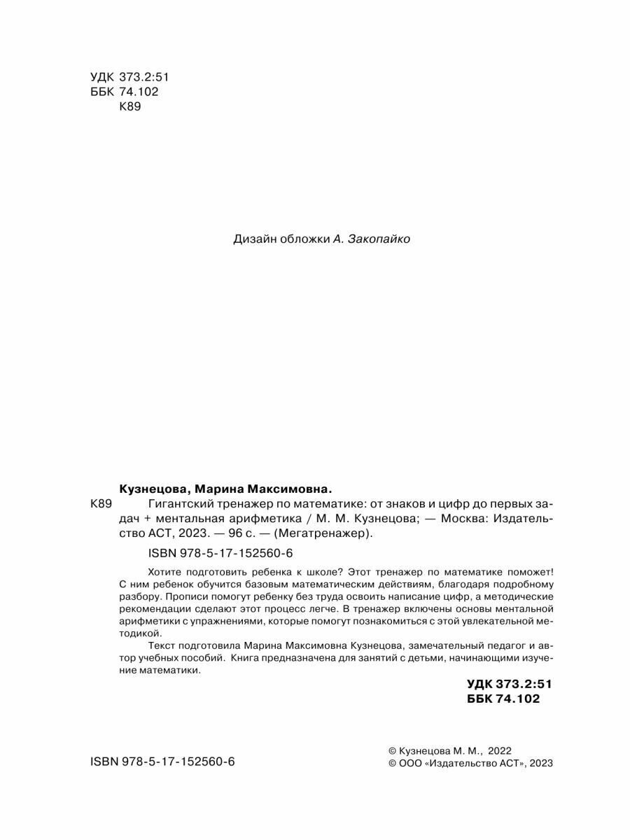Гигантский тренажер по математике: от знаков и цифр до первых задач + ментальная арифметика (Марина Кузнецова); Издательство АСТ, 2023