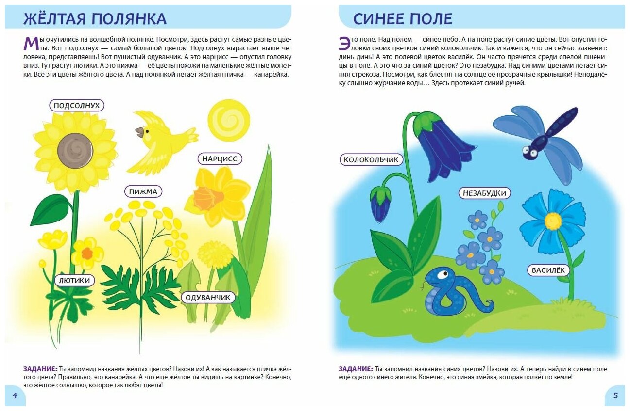 В этой книге признак цвета изучается на более качественном уровне: не просто называются цвета предметных картинках, а предлагается история и сюжетная картинка к ней. Таким образом, малышу наглядно показана связь изучаемого материала по сенсорному развитию с реальной жизнью. Изучаются такие цвета: жёлтый, красный, синий, зелёный, оранжевый, коричневый, фиолетовый, чёрный, белый, серый, розовый.