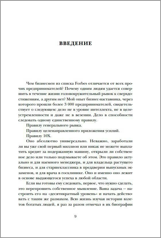 Написанная миллиардером, владельцем семи частных компаний, она раскрывает силу правила 10Х. Это правило формирует особый образ мышления и действий, который приводит к десятикратным результатам во всем, чем бы вы ни занимались. "Чтобы попасть точно в яблочко, нужно целиться выше мишени, - объясняет Гранд Кардон. - Чтобы заработать миллион, стоит замахиваться как минимум на десять миллионов, чтобы получить 100 миллионов - на миллиард".