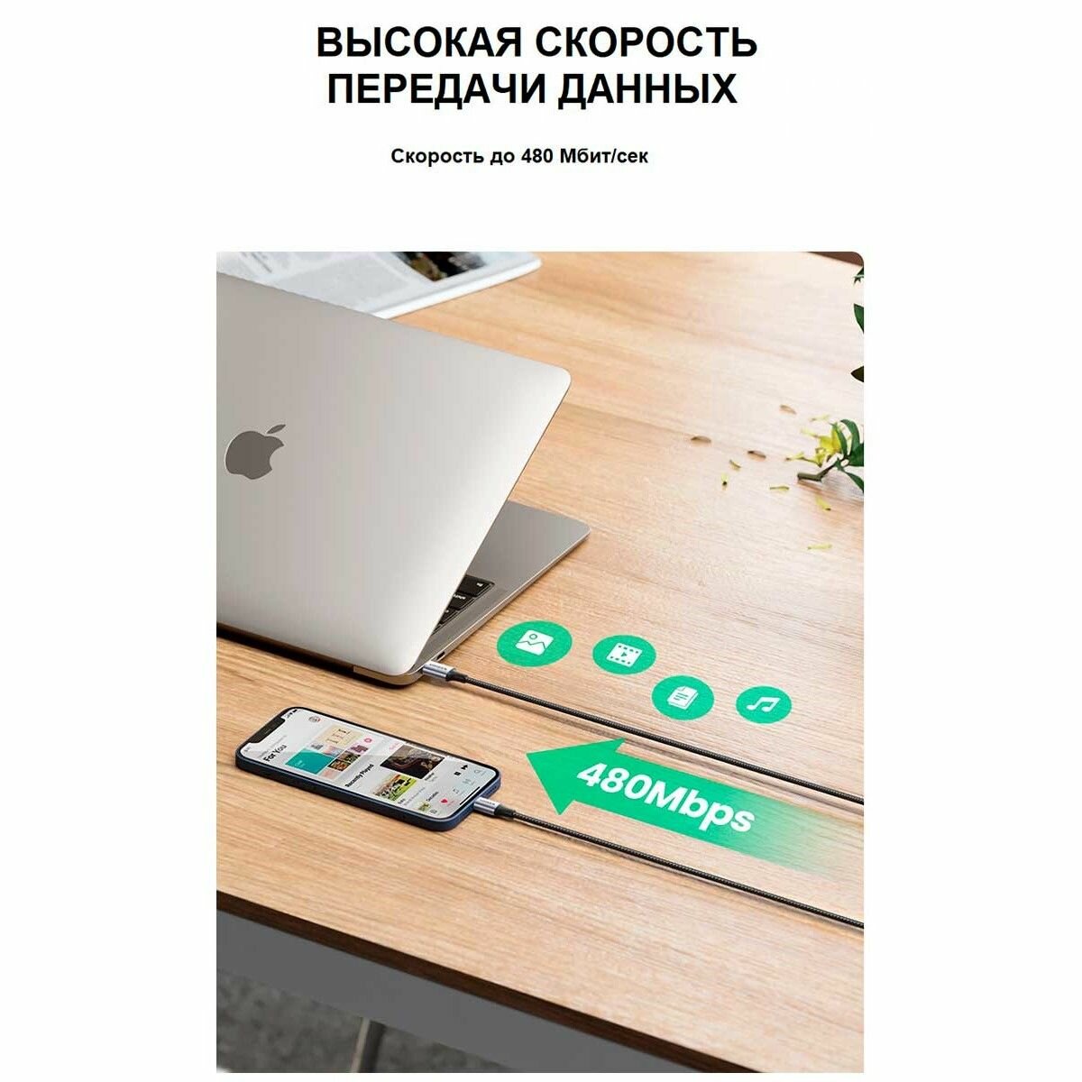 Заведите себе кабель Ugreen для гаджетов Apple с поддержкой быстрой зарядки PD. Он зарядит ваш смартфон, пока вы завтракаете. А оригинальный чип с сертификацией MFi гарантирует 100% совместимость. Кабель Ugreen прошел сертификацию MFI. Что означает Made for iPhone / iPad / iPod (создан для iPhone / iPad / iPod). Это лицензия фирмы Apple, которую она выдает сторонним производителям. Чтобы получить ее, нужно соответствовать массе строгих требований. У вас наверняка возник вопрос: «А что это дает мнеx» Вы получаете кабель: высокого качества, гарантированно совместимый с IOS в течение всего срока службы. Убедиться в том, что кабель официально одобрен, вы можете здесь, на официальном сайте Apple. Для этого выберите критерий поиска «Brand» и введите «Ugreen». Еще одна фишка кабеля – быстрая зарядка. Кабель поддерживает быструю зарядку Power Delivery и способен передавать через порт энергию до 18 Вт. Что это даетx С помощью этого кабеля вы зарядите iPhonexдо 50% всего за 30 минут. Важно: для использования быстрой зарядки ваш смартфон и сетевой адаптер также должны поддерживать протокол PD. Шнур кабеля имеет нейлоновую оплетку. Красиво смотрится, но это не главное. Попробуйте порвать руками шнурок. Придется очень постараться Плетеную «косичкой» оболочку провода тоже невозможно разорвать. Шнур внутри надежно защищен. Скручивайте его, растягивайте, завязывайте в узлы – с кабелем ничего не случится. Чаще всего кабель страдает в области шт.екеров: они расшатываются, а провод в этой области переламывается. Кабелю Ugreen это не грозит. Алюминиевые шт.екеры надежны и долговечны. Кроме того, в области сгиба шт.екеры имеют полиуретановую защиту от перегиба. Используйте его везде! Для зарядки дома от сети или ноутбука, в дороге от повербанка или в автомобиле. Передавайте музыку и фотографии с телефона на компьютер и наоборот. Скорость передачи данных – 480 Мбит/с.