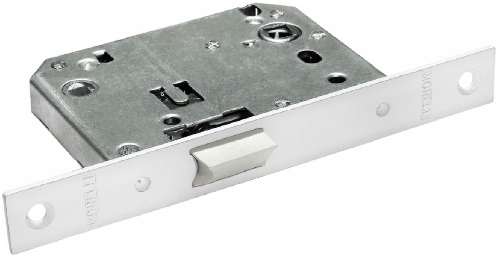 Защелка межкомнатная бесшумная сантехническая MORELLI 1895P W, цвет белый предназначена для межкомнатных дверей с последующей установкой дверной ручки в верхнее отверстие защелки и (если это необходимо) сантехнической завертки - в нижнее. Межосевое расстояние 96 мм. Защелка имеет универсальную направленность - может быть установлена на полона как правого, так и левого отпирания. Язычок защелки выполнен из пластикого композита, что обеспечивает почти бесшумную работу. Торцевая планка защелки имеет скругленные углы, что удобно при подготовке посадочного места при врезке фрезой и задает аккуратный внешний вид врезке. Саморезы и ответная планка в цвет изделия в комплекте. Упаковка картонная с держателем для навески.