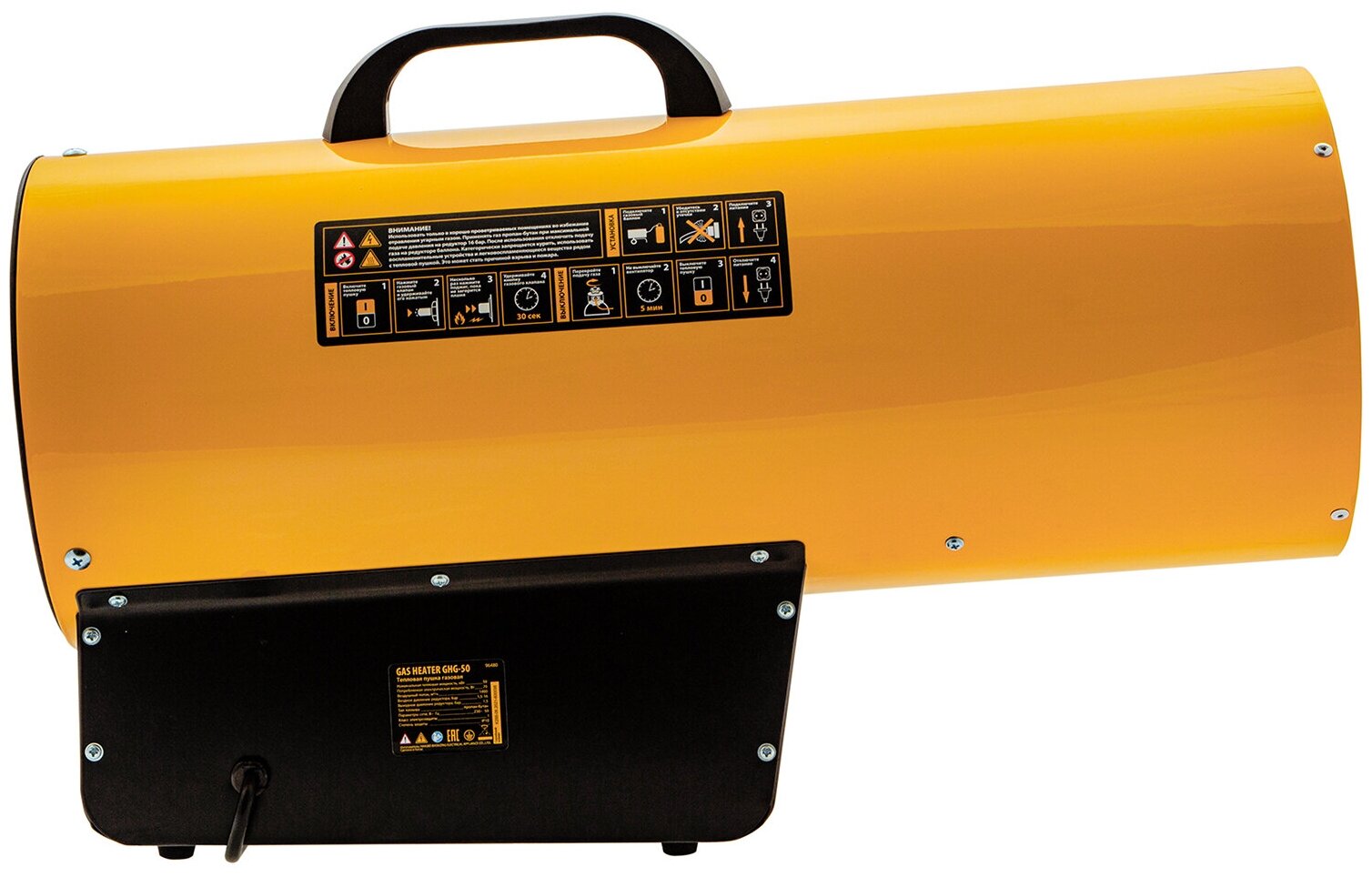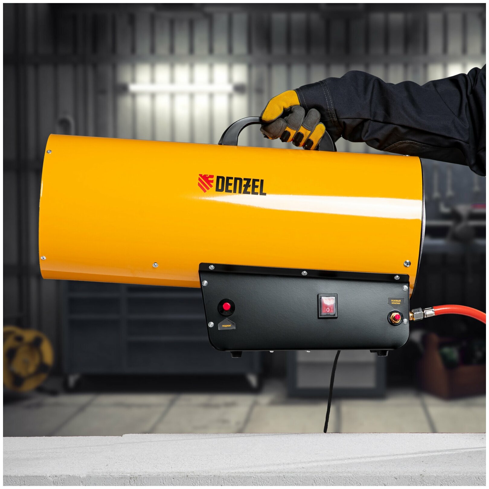 Газовая тепловая пушка Denzel GHG-50 имеет тепловую мощность 50 кВт и применяется для работы в мастерских, гаражах, строящихся объектах, теплицах, фермах и на складах. Тепловая пушка отличается высокой производительностью 1400 м3/ч при экономичном расходе топлива 3,3 кг/ч и компактных габаритах.Преимущества Защита от перегрева. В случае перегрева подача газа автоматически прекращается, что предотвращает развитие аварийной ситуации и возникновение пожара Пьезоподжиг позволяет быстро и безопасно запустить теплогенератор Корпус из листовой стали окрашен термостойкой краской и устойчив к возникновению коррозии Передняя решетка из нержавеющей стали рассчитана на долгий срок службы Задняя решетка не допускает попадание посторонних предметов внутрь пушки, защищая ее от поломок Выключатель электропитания закрыт защитным кожухом, который не допускает попадания пыли и влаги к внутренним частям Газовый шланг с редуктором и сетевая вилка входят в комплект поставки Ручка на верхней части корпуса и небольшой вес 6,8 кг делают удобной транспортировку пушки и ее погрузку в машину Широкая платформа придает тепловой пушке устойчивость Яркий дизайн