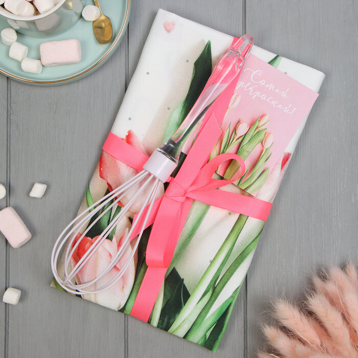 Кухонный набор женский от Этель: полотенце кухонное 40х73 см, венчик кухонный. Хлопковое полотенце кухонное обладает высокой впитываемостью, компактные размеры позволяют использовать его как салфетку или дорожку на стол. Полотенце идеально подойдет для декора кухни, гостиной, столовой и дачи, летней веранды и уютного кафе. Набор для кухни - отличный подарок любой хозяйке, маме, бабушке, сестре, подруге, коллегам и друзьям. Можно подарить на 14 февраля, 8 марта, день рождения, день матери, Татьянин день, новый год. Рекомендации по уходу: деликатная стирка при 30С, не отбеливать. Вы также можете рассмотреть другой товар для сервировки кухни и праздничного стола в нашем магазине TEX. YOU store: кухонные дорожки, салфетки, мешочки для хранения и многое другое.