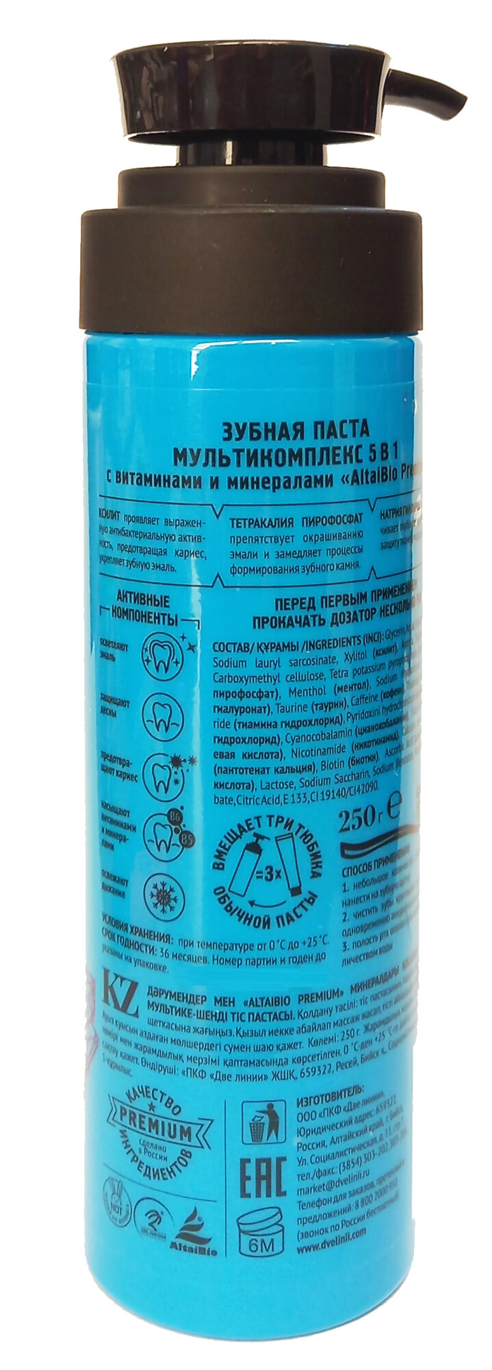 Гелевая зубная паста в удобном флаконе с дозатором не только комплексно воздействует на полость рта, но и позволяет приятно сэкономить. 1 флакон пасты ALTAI BIO PREMIUM = 3 упаковки обычной зубной пасты. СОДЕРЖИТ ПОЛНОЦЕННЫЙ ВИТАМИННЫЙ КОМПЛЕКС!Богатый состав витаминно-минеральной зубной пасты ALTAI BIO PREMIUM позволяет ей активно воздействовать сразу в пяти направлениях: - осветляет эмаль; - защищает десна; - предотвращает кариес; - насыщает ткани витаминами и минералами; - освежает дыхание.
