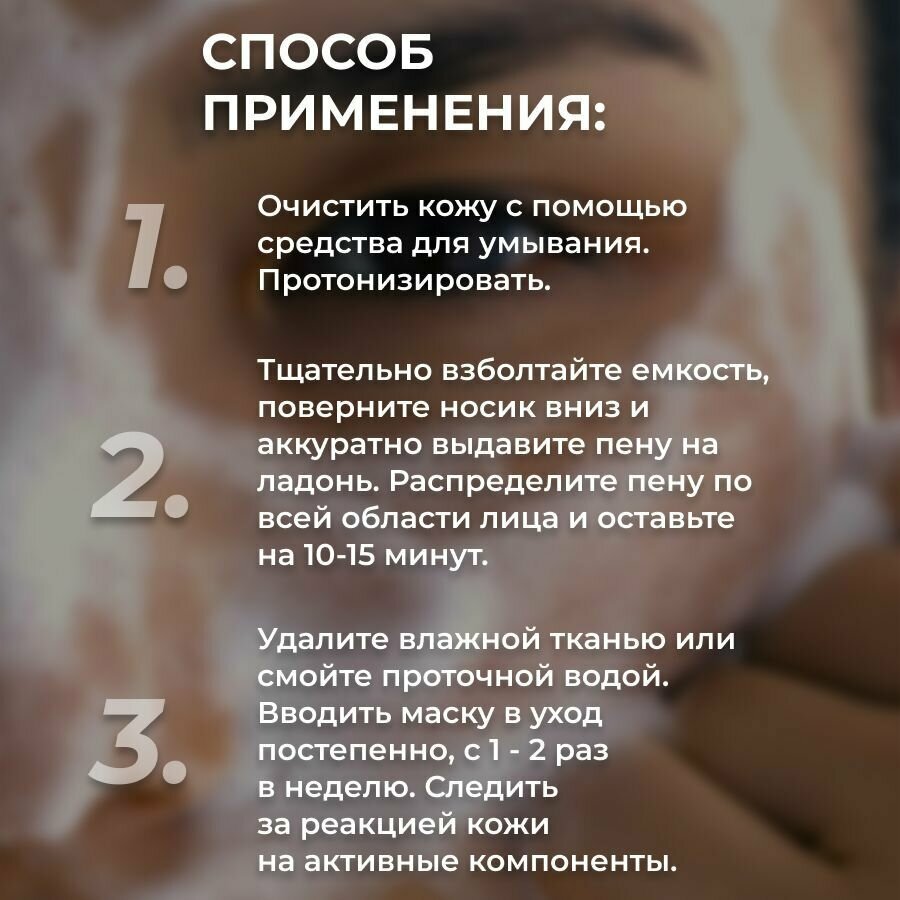 | Способ применения | Тщательно взболтайте флакон. Поверните носик вниз и аккуратно выдавите пену на ладонь. Распределите пену по всей области лица и оставьте на 10-20 минут. Удалите влажной тканью или смойте проточной водой. |
