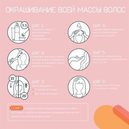 Крем-краска для интенсивного тонирования волос бережно освежает их цвет, не повреждая структуру, благодаря отсутствию аммиака в составе и низкой концентрации пероксидов. Средство перекрывает седину до 50%, сохраняет стойкость до 24 раз мытья головы. Не дает четкой границы между окрашенной частью и отросшей прикорневой зоной.Способ применения:Смешать краситель с окислительной эмульсией 1,9% (6 Vol.) или 4% (13 Vol.) в пропорции 1:2. Нанести смесь на предварительно вымытые и высушенные полотенцем волосы, равномерно распределяя от корней до концов. Выдержать до 20 минут, затем тщательно смыть.