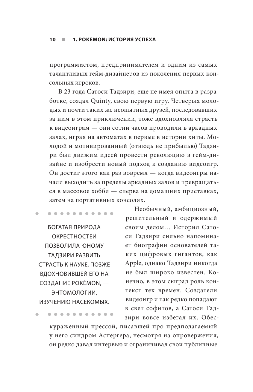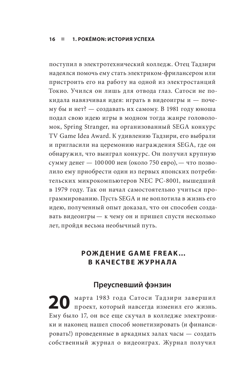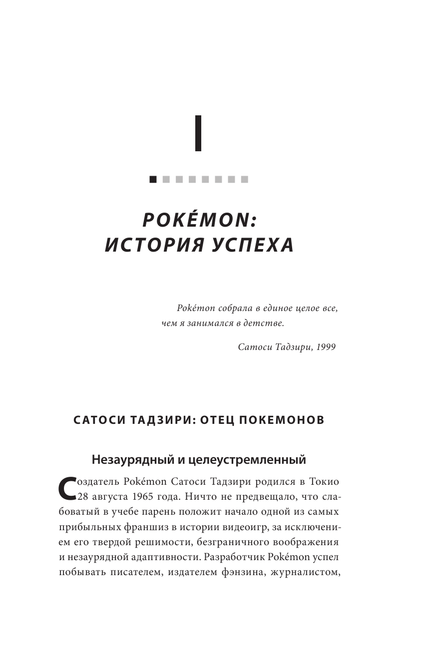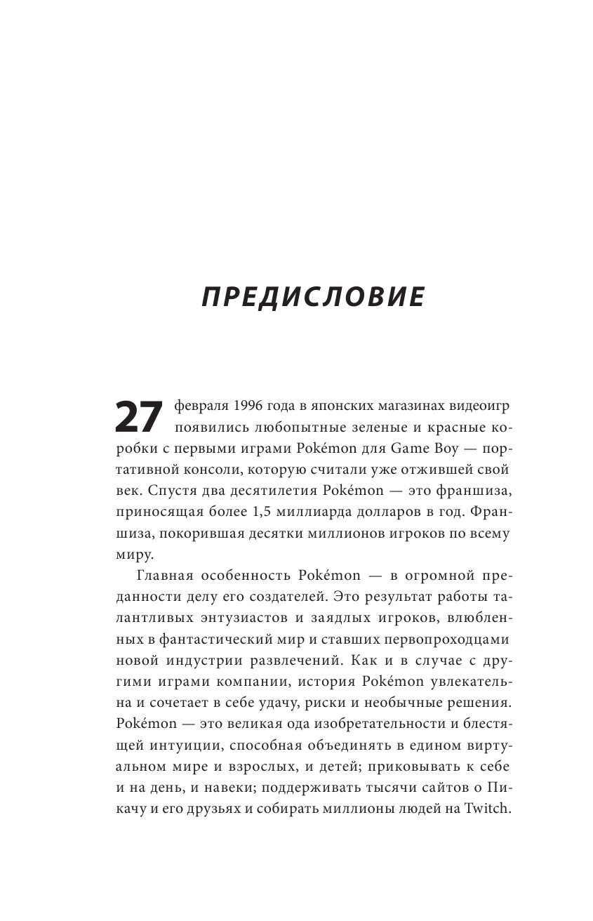 В этой книге подробно рассказывается, как, где и откуда зародилась многомиллионная индустрия, большое внимание уделяют разработке и механике игры, а также о мерче и истоках успеха серии, которая в отличие от нашей страны остается значительной частью массовой культуры на Западе и в самой Японии – там продолжают выходить новые игры с новыми покемонами, совершенствуется графика и игровой процесс. -