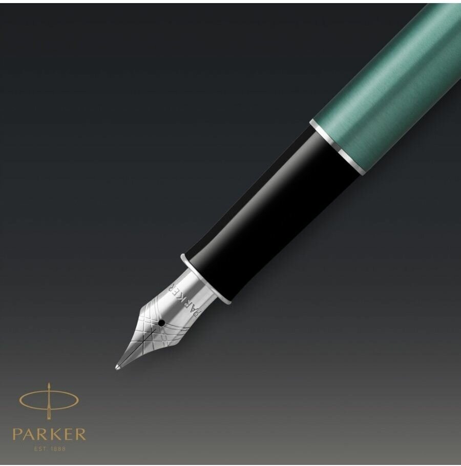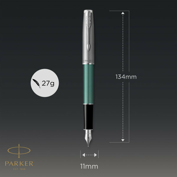 Перо : нержавеющая сталь. Отделка пера : никель-палладиевое покрытие, оригинальный перекрестный рисунок с гравировкой. Корпус : нержавеющая сталь, колпачок - матовая поверхность. Система заправки : картриджно-конвертерная. Механизм : съемный колпачок. Отделка : нержавеющая сталь с пескоструйной обработкой матовой поверхностью, отдельные элементы дизайна - никель-палладиевое покрытие. Цвет: зеленый / серебристый. Особенности : колпачок защелкивается. зона захвата: высококачественный пластик. торец ручки сделан из ювелирной латуни с черной пластиковой вставкой, зажим колпачка сталь, кольцо латунь, никель-палладиевое покрытие. стандартная комплектация: ручка перьевая, конвертер Parker Standart, 2 черных стандартных картриджа..