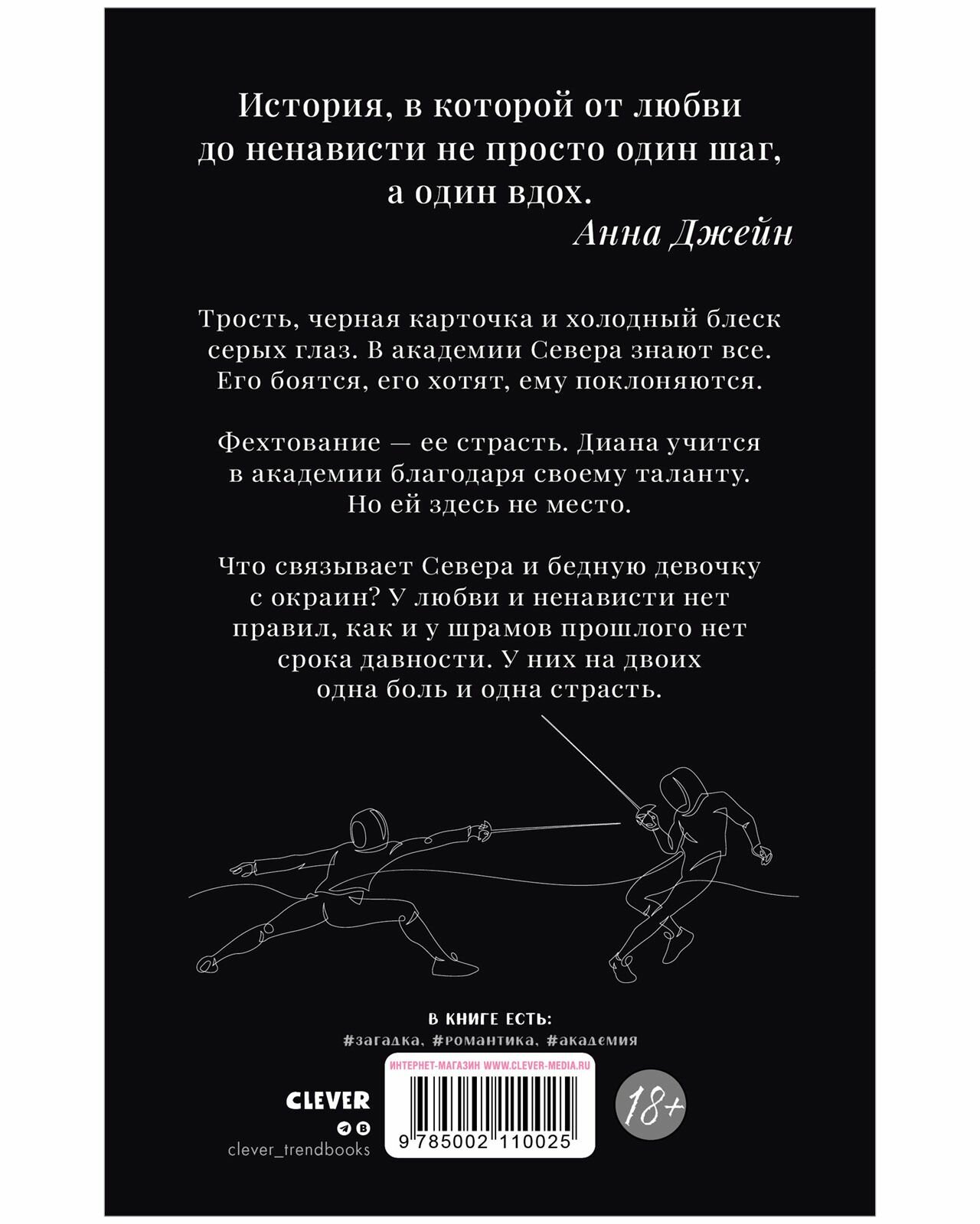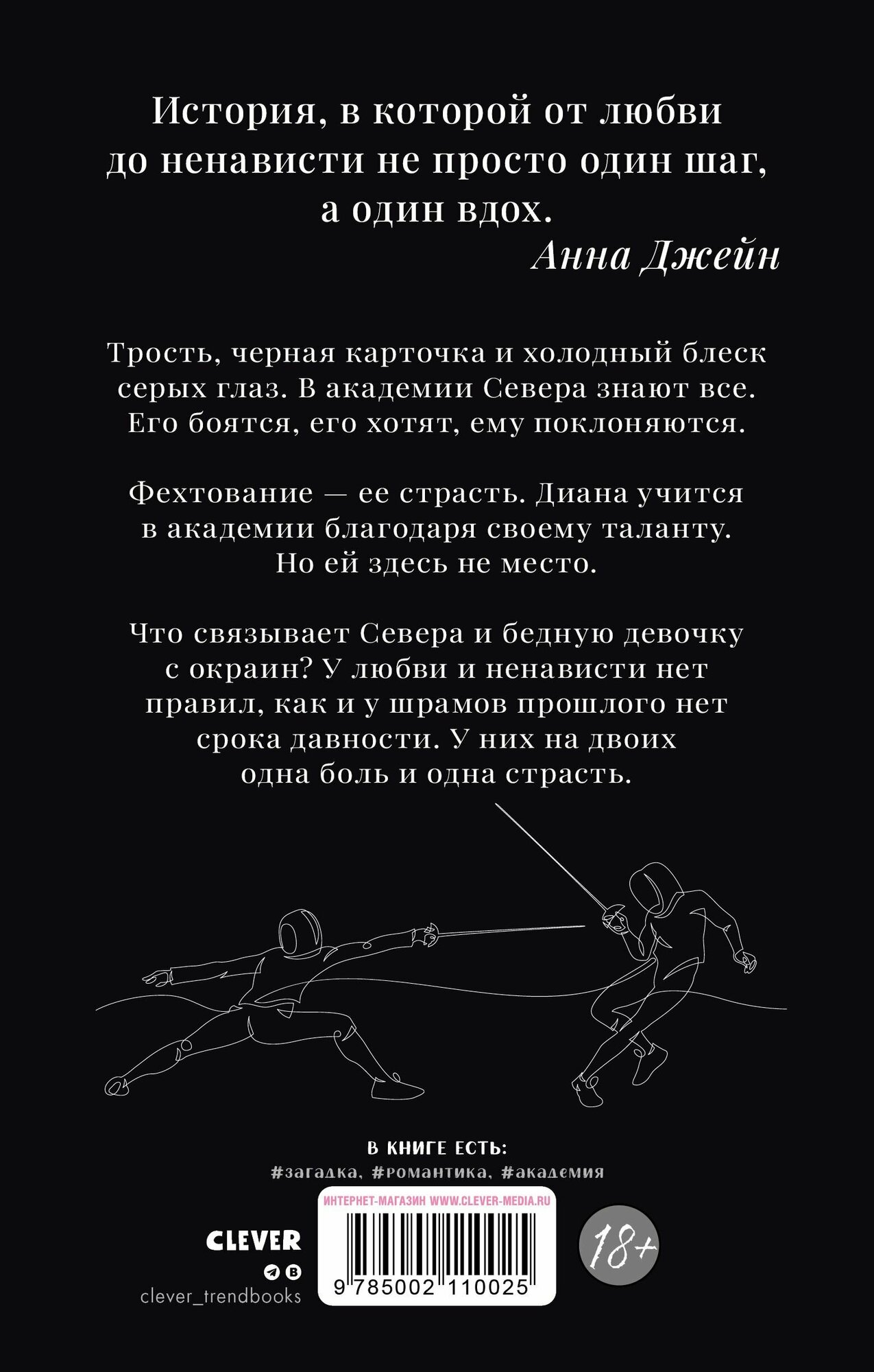 Трость, черная карточка и холодный блеск серых глаз. В академии Севера знают все. Его боятся, его хотят, ему поклоняются. Фехтование — ее страсть. Диана учится в академии благодаря своему таланту. Но ей здесь не место.Что связывает Севера и бедную девочку с окраин? У любви и ненависти нет правил, как и у шрамов прошлого нет срока давности. У них на двоих одна боль и одна страсть.