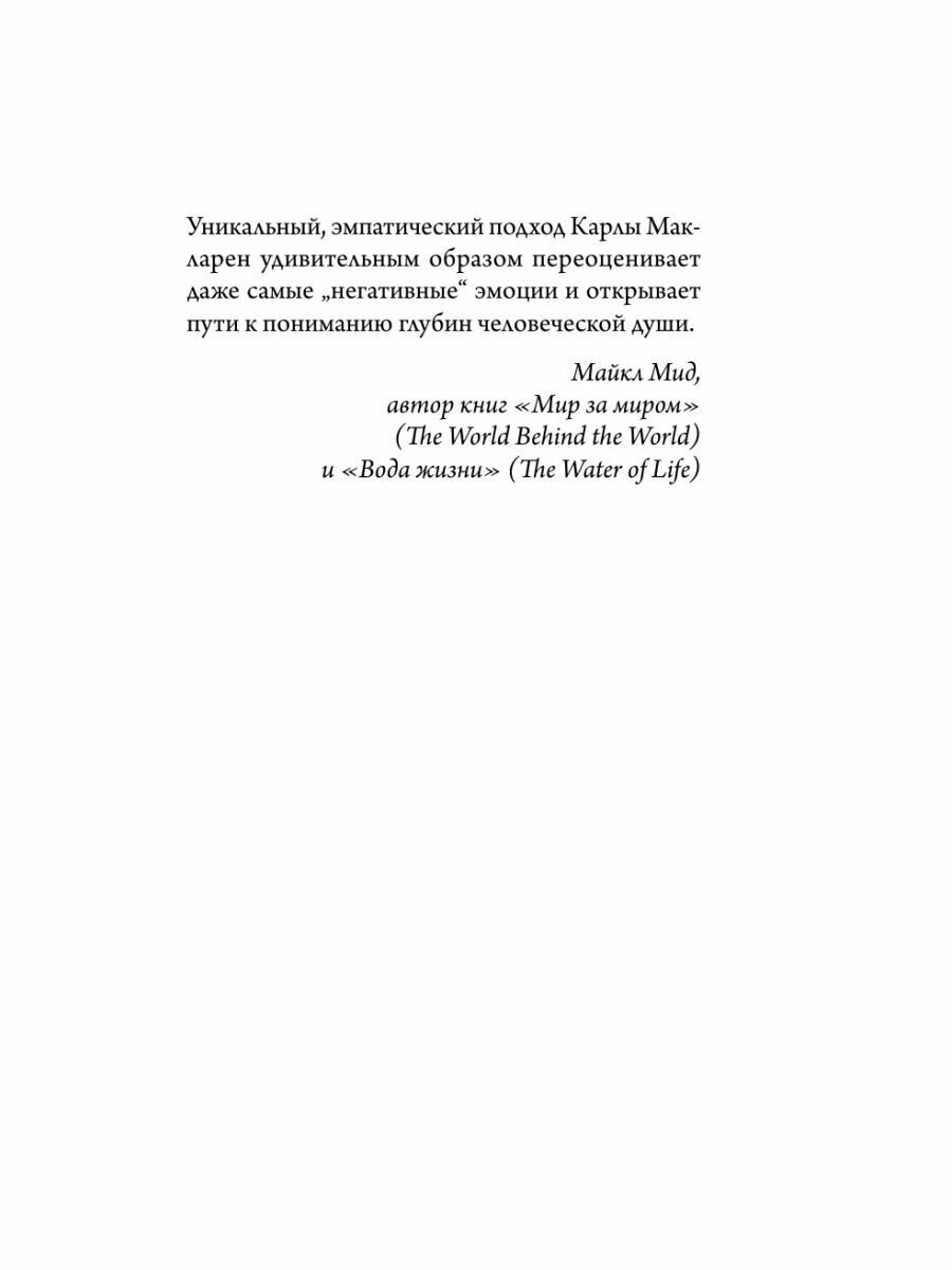 у меня нет слов, чтобы описать все свои чувства к этой книге. она действительно помогла мне глубже заглянуть в себя и понят, какие эмоции я запрещал себе испытывать, в числе которых как раз-таки гнев. эту эмоцию порицают, не одобряют и всячески пытаются от нее отвязаться, как от надоедливой мухи. однако работа карлы макларен показывает как важно по-настощему позволить себе ощущать те или иные вещи. я восхищен ее работой.