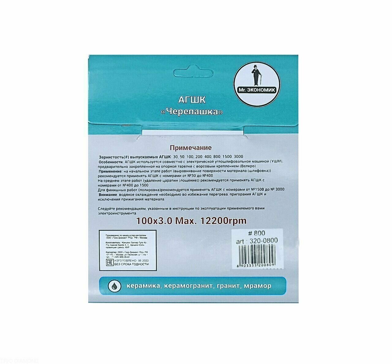 Алмазный гибкий шлифовальный круг Mr. Экономик Черепашка предназначен для шлифовки и полировки искусственного и натурального камня. Он имеет наружный диаметр 100 мм и зерно 800.Преимущества Подходит для мокрой шлифовки, что обеспечивает более точную и качественную обработку материала Оснащён креплением на липучке, что облегчает процесс замены круга и позволяет быстро менять насадки при необходимости Имеет наружный диаметр 100 мм, что обеспечивает достаточную площадь контакта с обрабатываемой поверхностью и повышает эффективность работы Зерно 800 позволяет проводить как грубую, так и финишную шлифовку, в зависимости от требуемой степени обработки материала