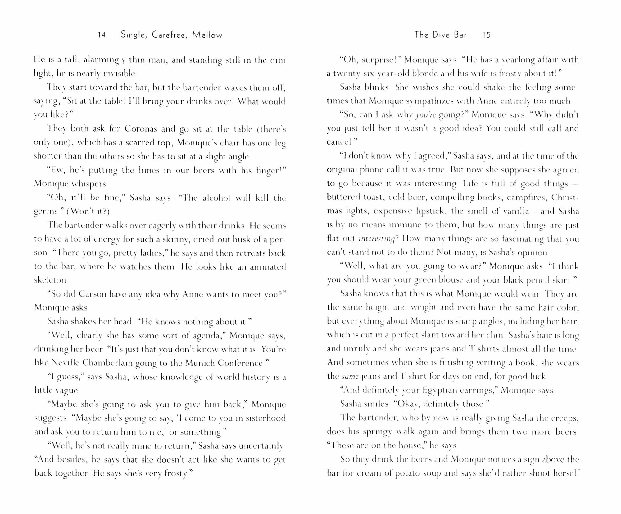 These women are best friends, roommates and mistresses. They tipple and titillate, fantasize and fumble, worry and wander. They make poor choices in men and children's magicians and wise choices in what to wear to meet their lovers' wives. None of them are single (or carefree or mellow) but all are irresistible and all too familiar.