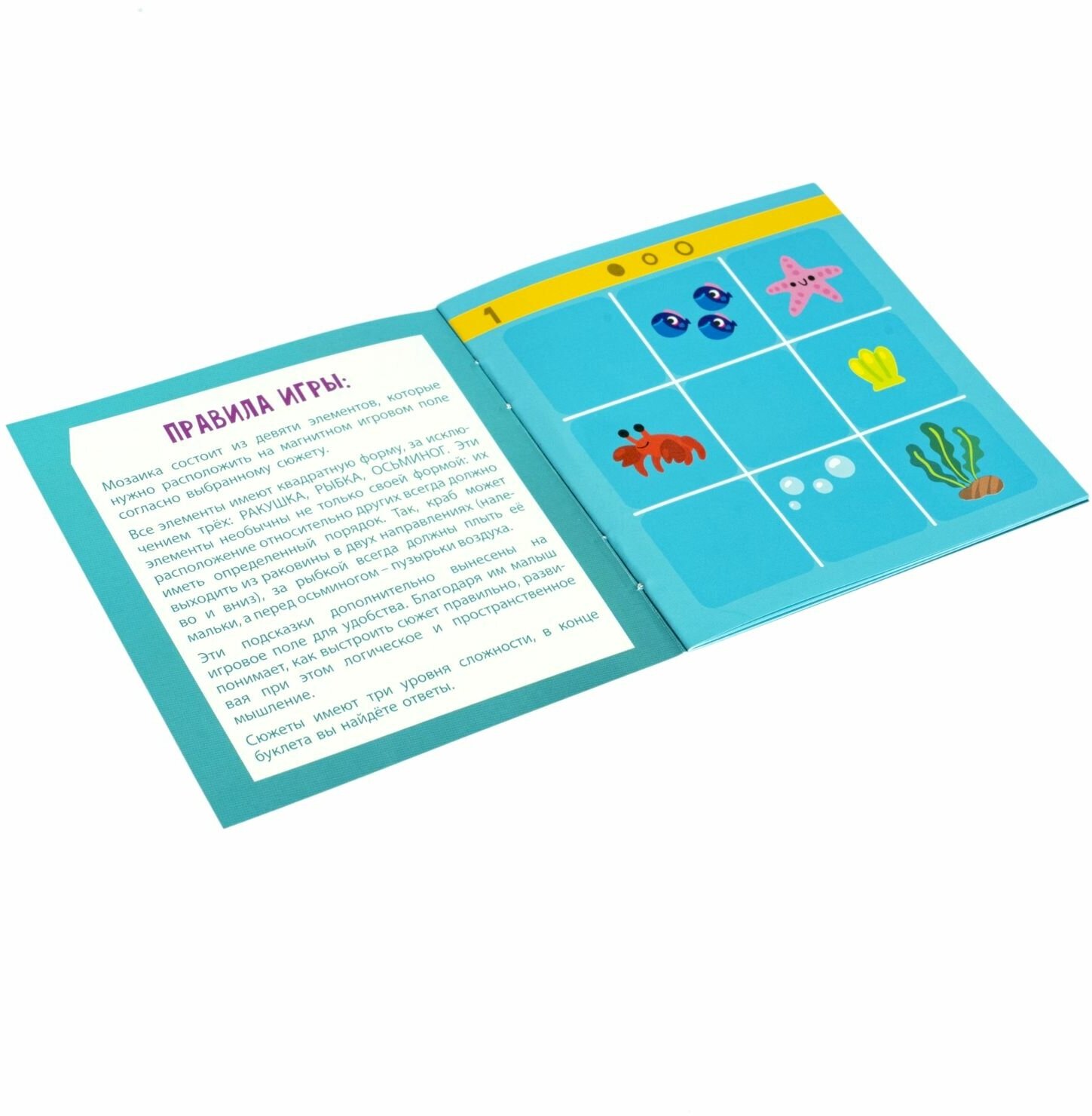 Мозаика состоит из 9 элементов, которые нужно расположить магнитном игровом поле. Все элементы квадратные, за исключением трех: ракушка, рыбка, осьминог.