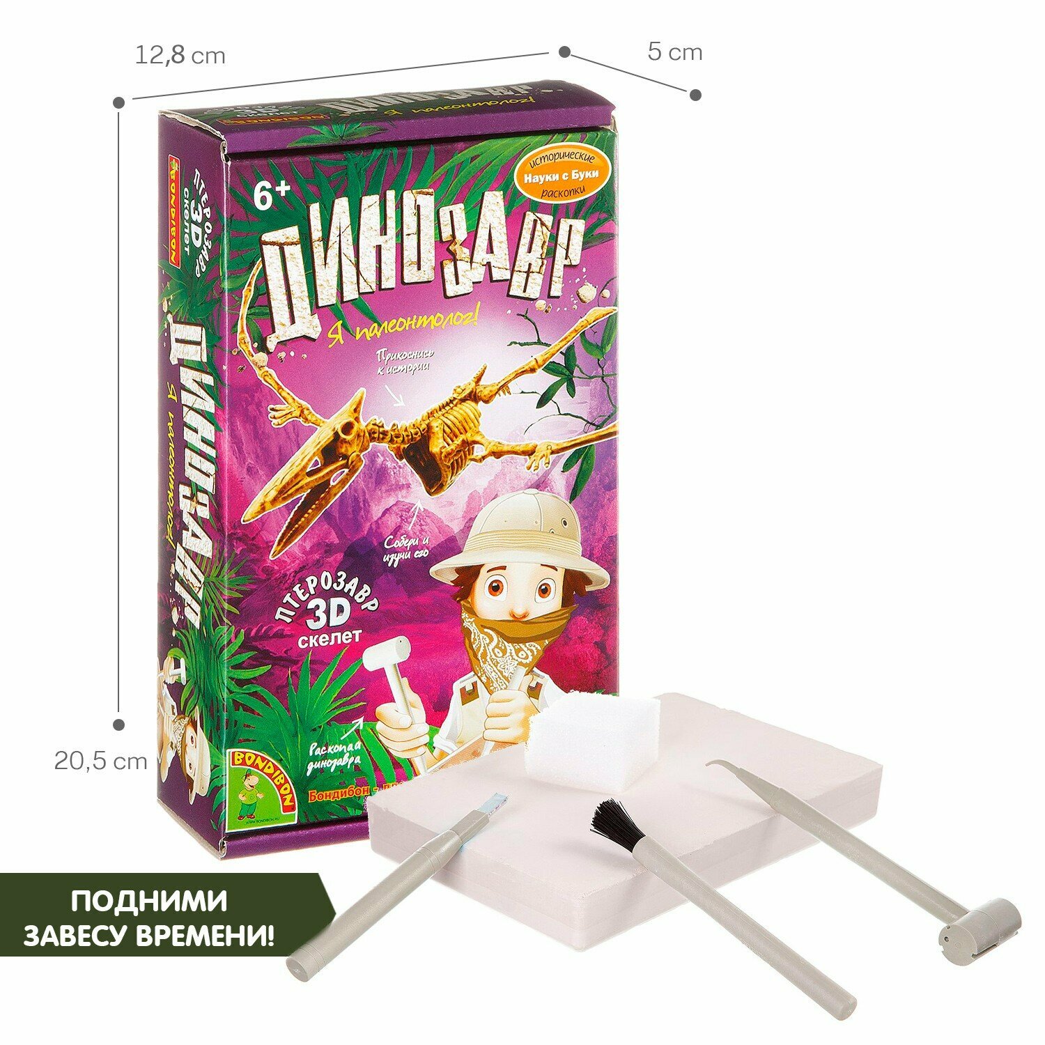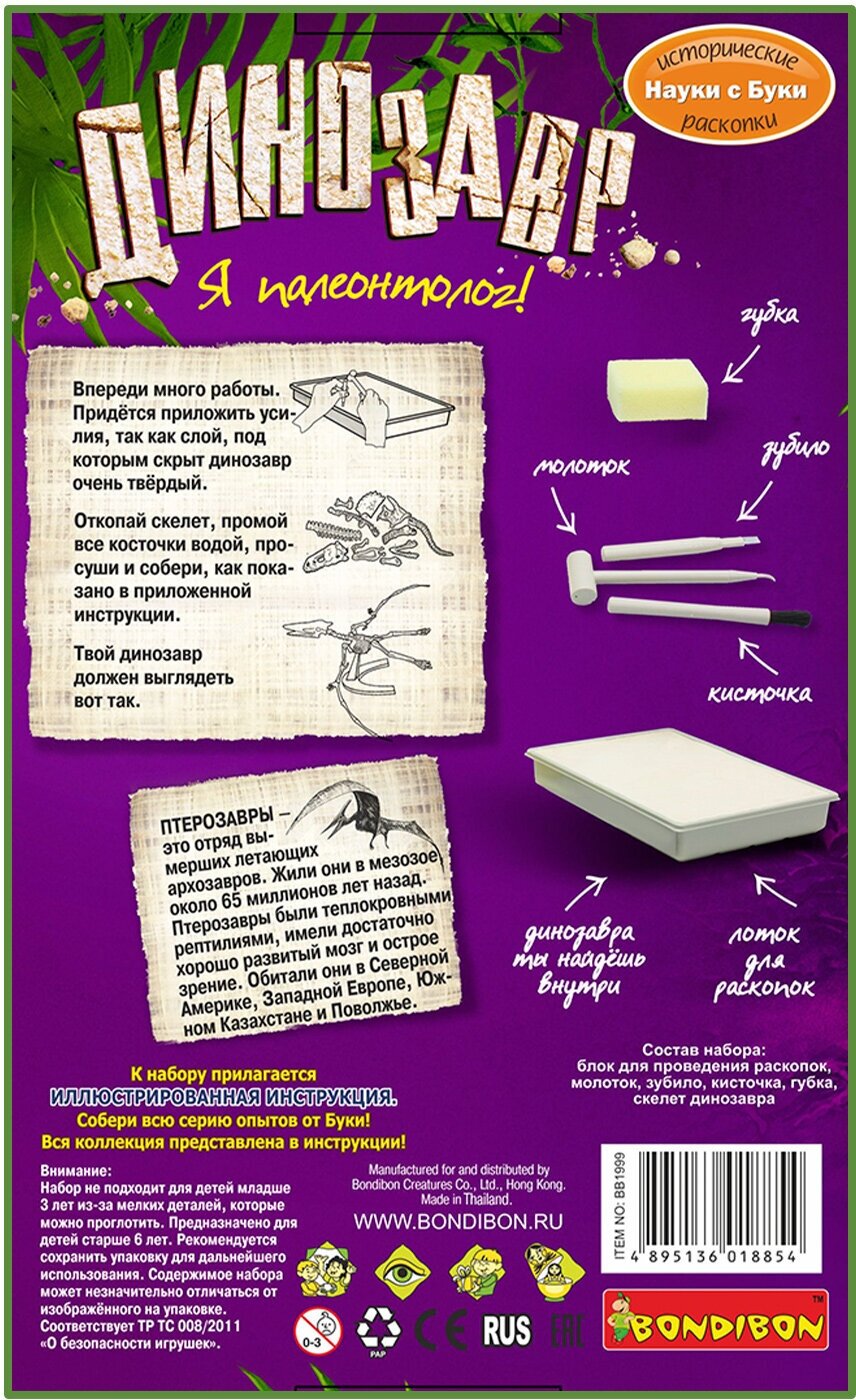 Узнавать интересные факты и самому обнаружить птерозавра можно в любом возрасте. Даже самые маленькие могут почувствовать себя палеонтологами, изучающими древний мир, с набором для проведения палеонтологических раскопок "Птерозавр". Используя набор настоящих инструментов палеонтолога, ребенок сможет самостоятельно найти скелет самого древнего животного на Земле, очистить его от вековой пыли, а затем собрать реалистичную 3D-модель динозавра! Даже если с первого раза все получится неидеально, ничего страшного. Подробная инструкция покажет, как собранный скелет можно использовать для повторной игры.