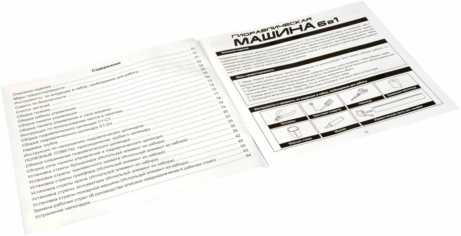 В моделях из набора используются 3 гидравлические системы для приведения моделей в движение. Техника работает в точности, как в настоящих машинах. Платформа вращается на 360 градусов.