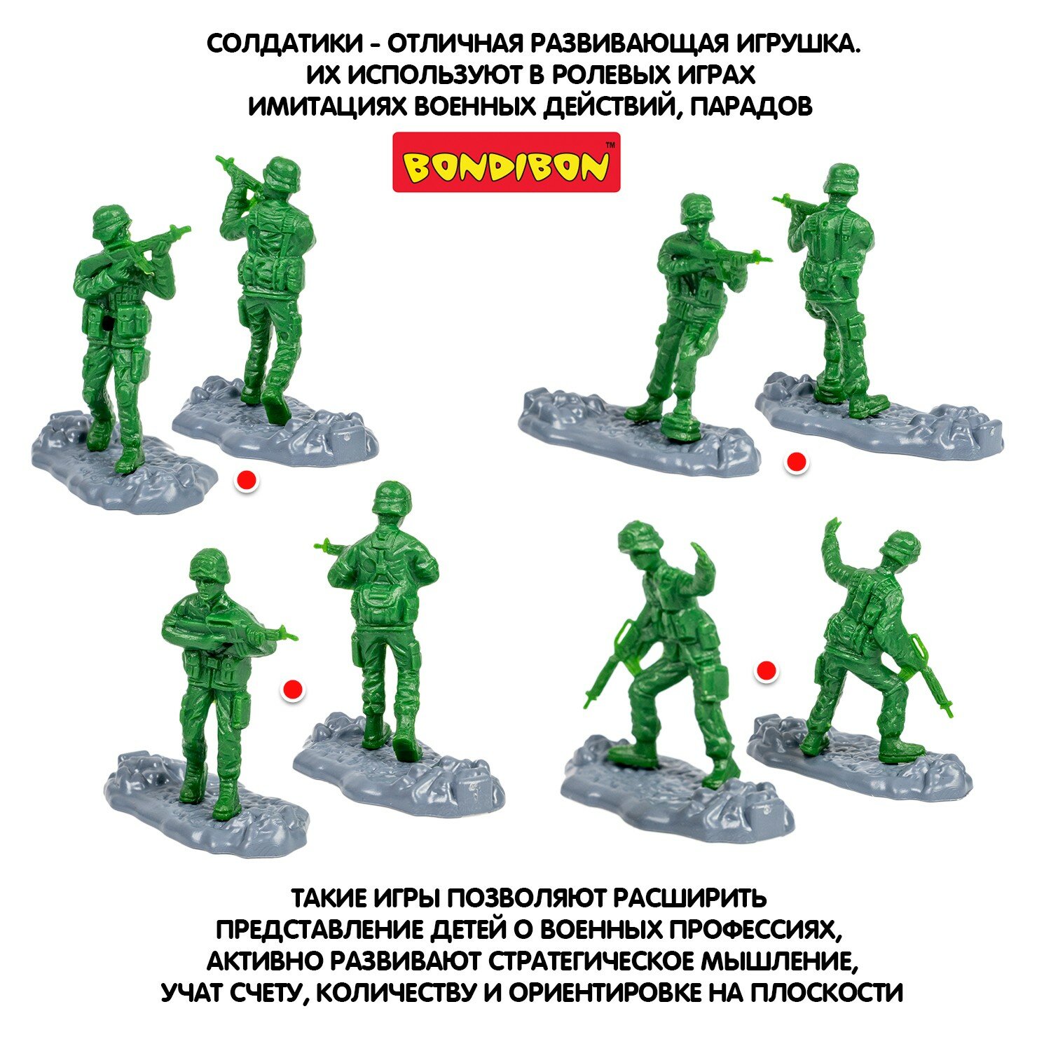 Набор армии Bondibon пригодится мальчику для того, чтобы разыгрывать сюжетно-ролевые игры, развивая воображение и моторику. А еще активно развивается логическое мышление, и ребенок учится мыслить стратегически, как полководец!