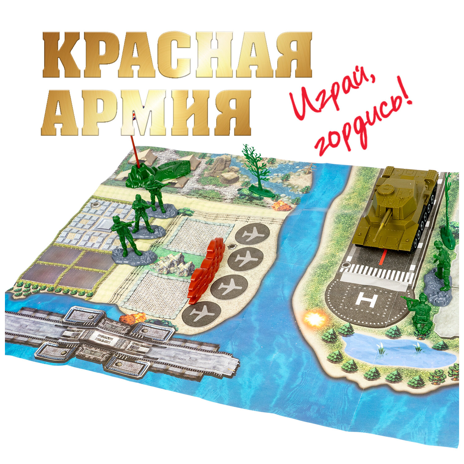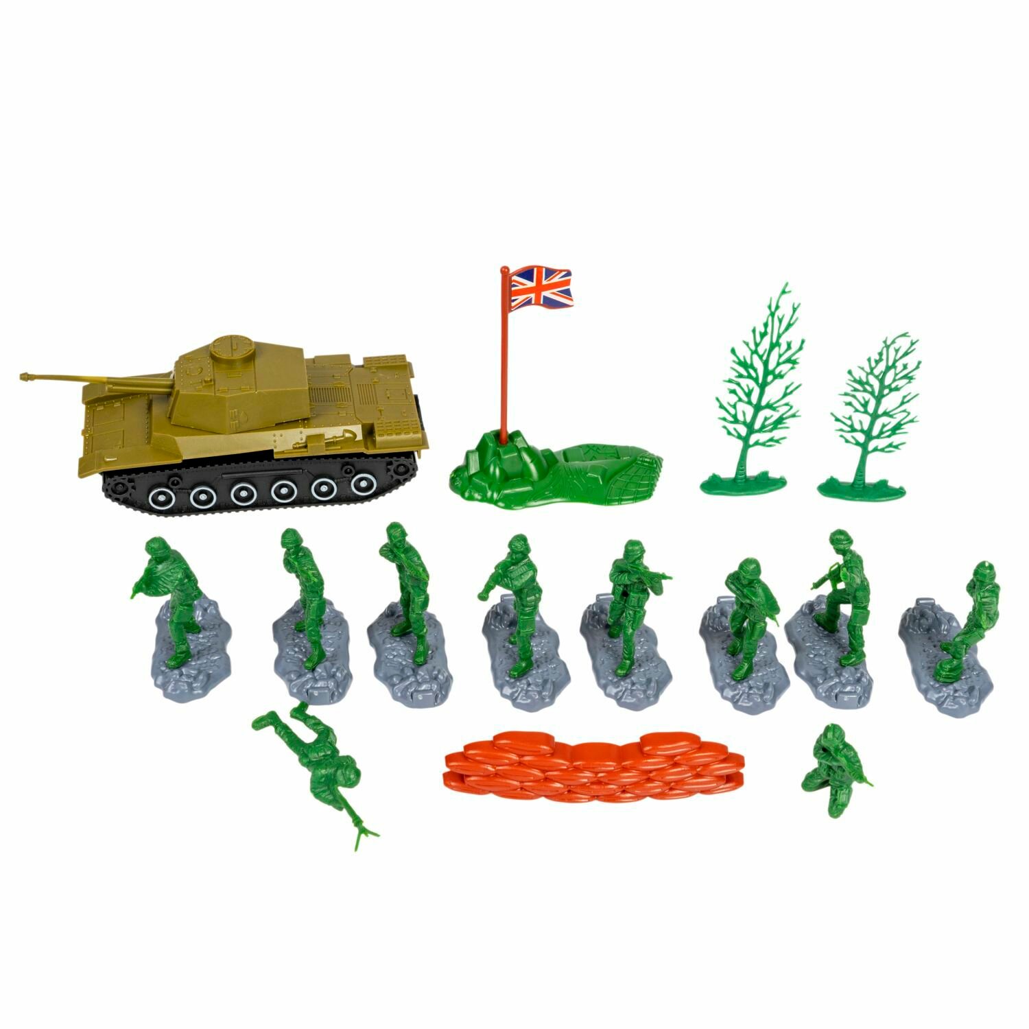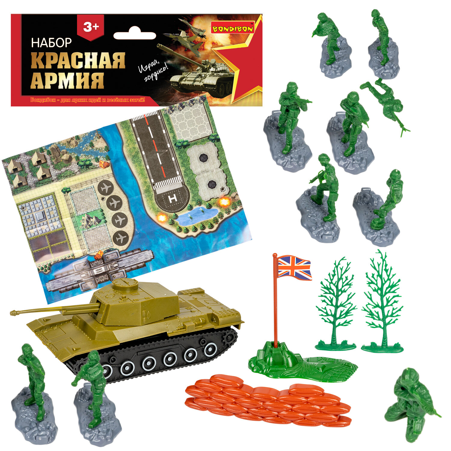 Игровой набор состоит из 10 разных фигурок солдат с оружием, танка, военной карты и других аксессуаров. Возраст 3+