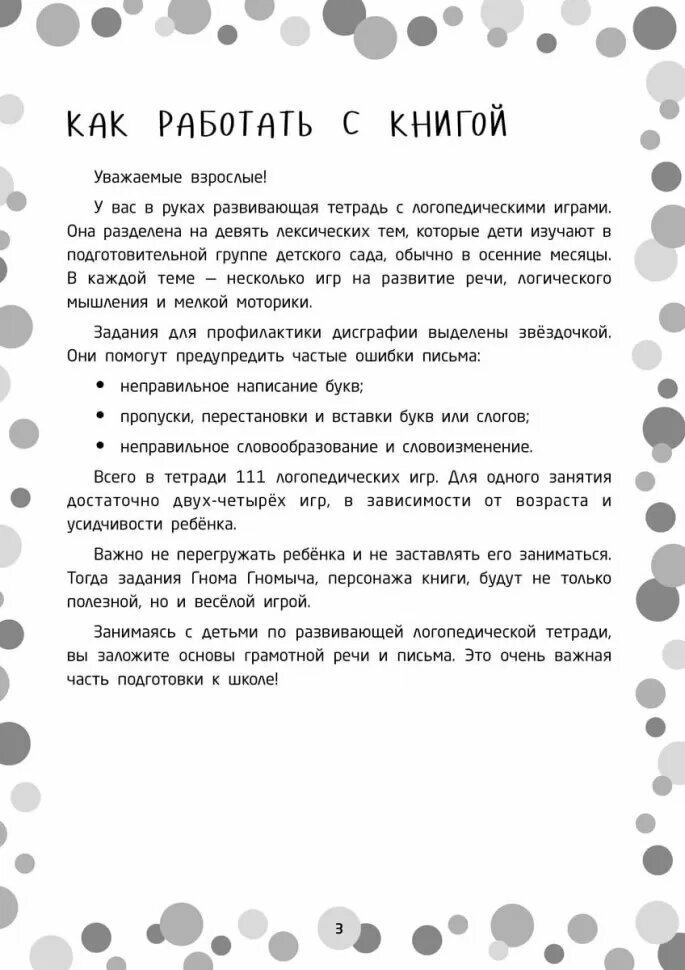 В каждой теме - несколько игр на развитие речи, логического мышления и мелкой моторики. Задания для профилактики дисграфии выделены звездочкой: они помогут предупредить частые ошибки письма.
