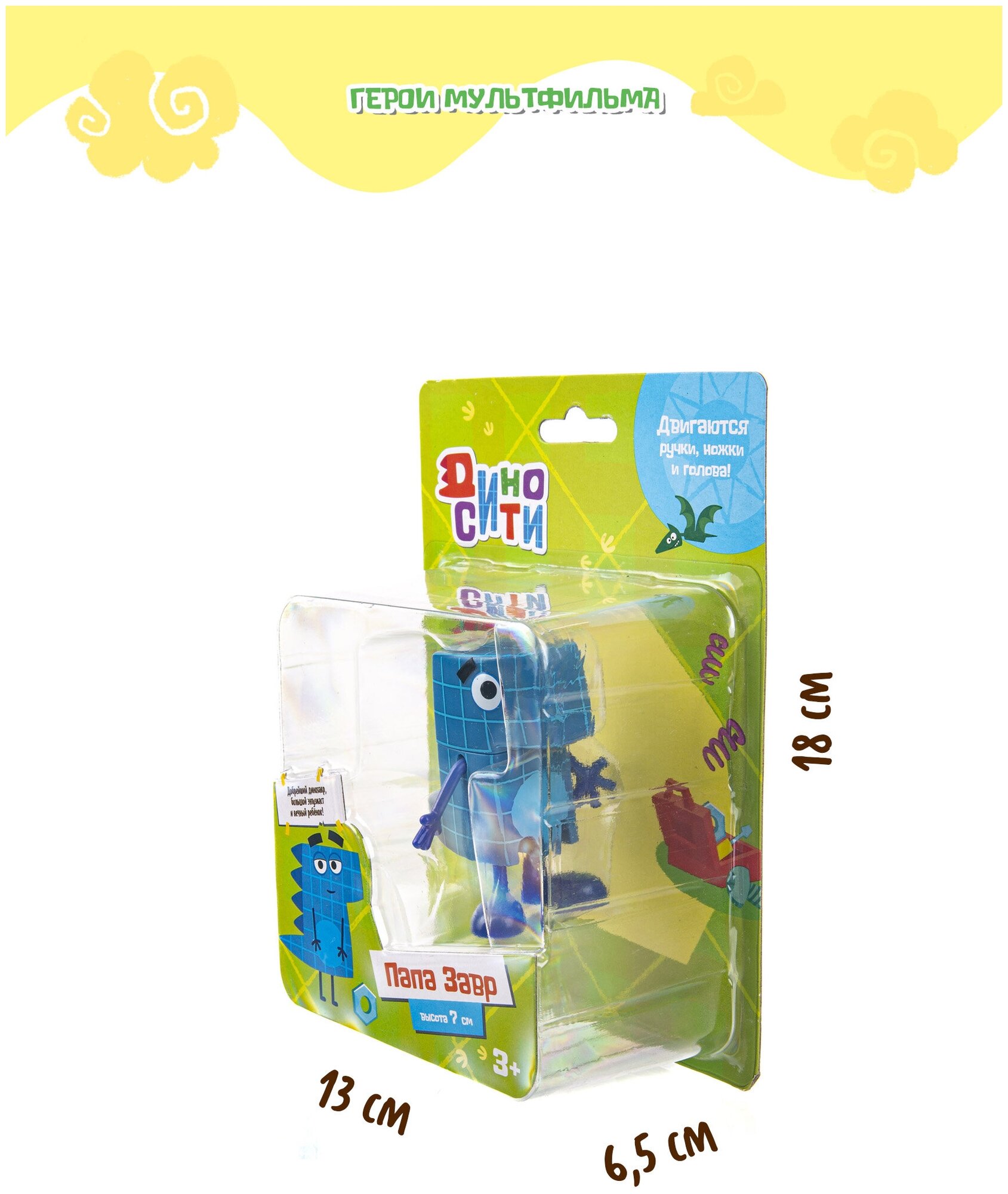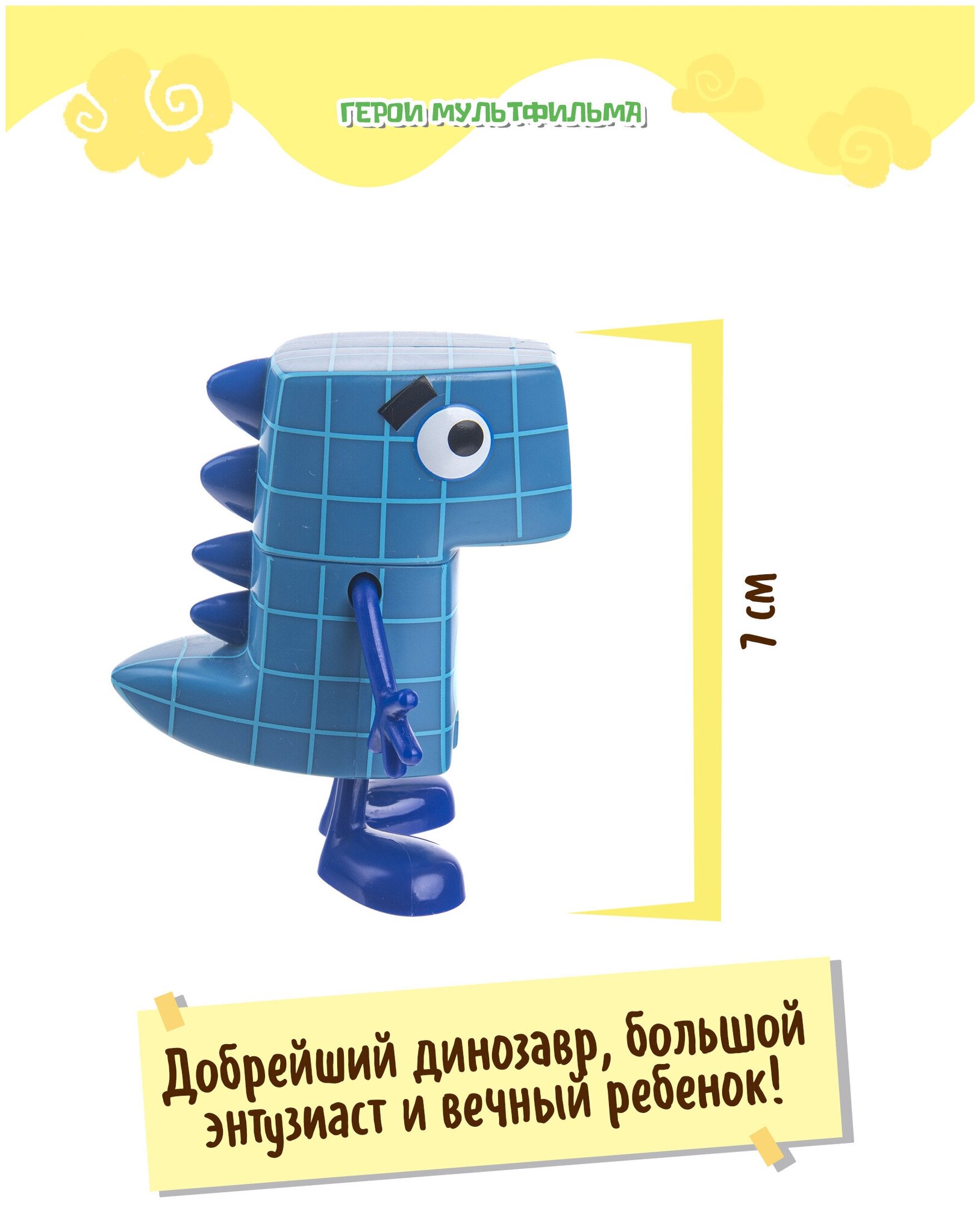 Это добрейший динозаврик папа Завр! У этой фигурки подвижные ручки, ножки и голова. Фигурка устойчиво стоит на поверхности, а также может сидеть. Высота фигурки 7 см.