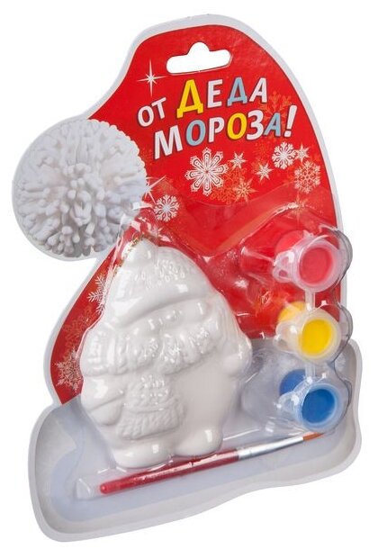 В комплекте есть всё необходимое для росписи керамической фигурки: сама фигурка и 3 разноцветные краски с кисточкой.