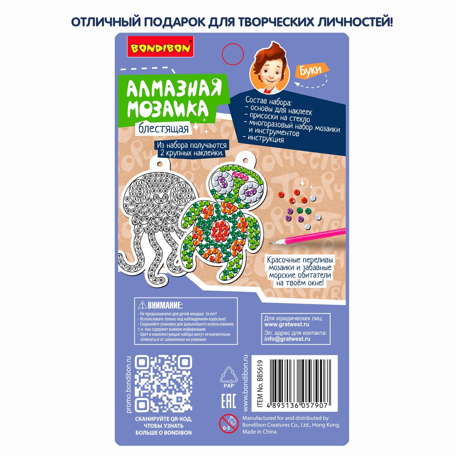 | Комплектация | набор для творчества Bondibon - 1 шт; алмазная мозаика блестящая - 2 шт; присоски на стекло - 2 шт; инструкция |