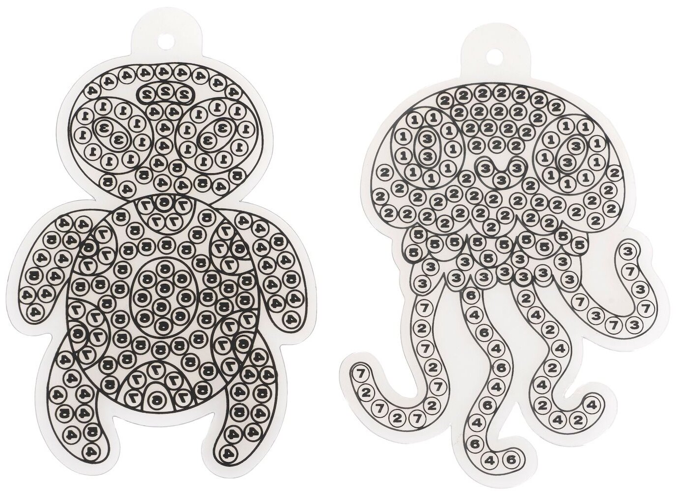 У Вас получатся 2 крупных стикера (9х13 см)- веселая медуза и морская черепаха. Готовые наклейки прикрепите к стеклу с помощью присосок.
