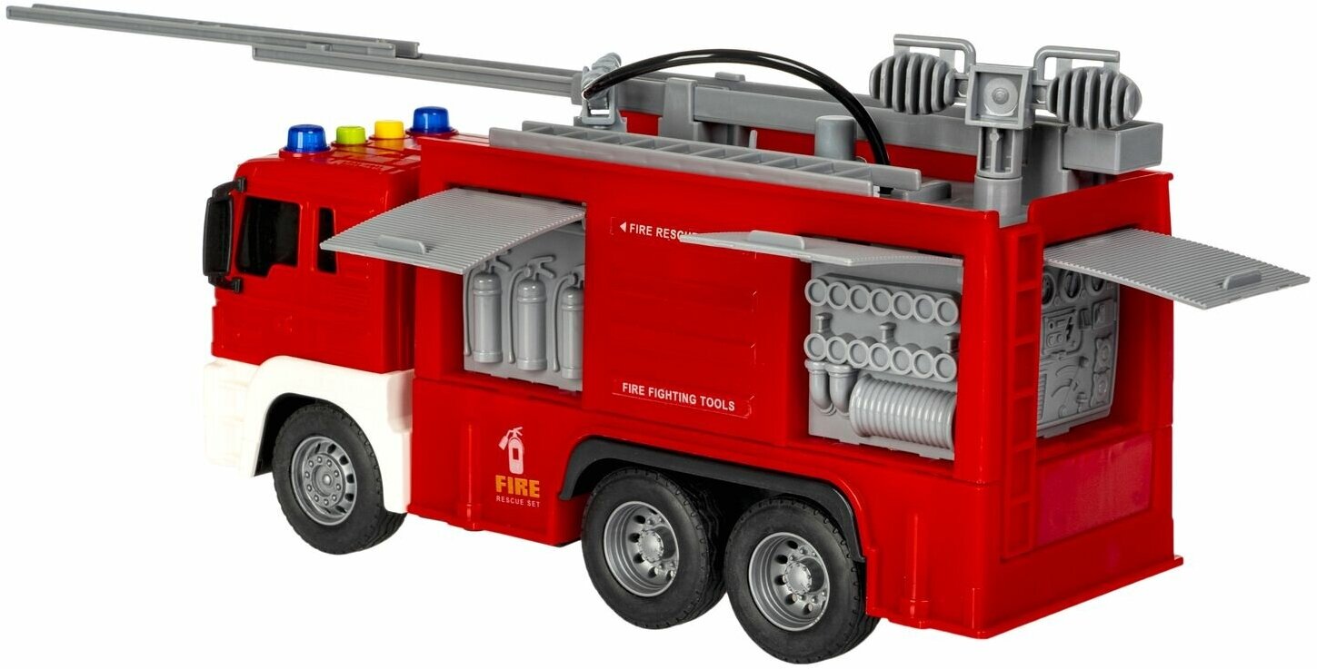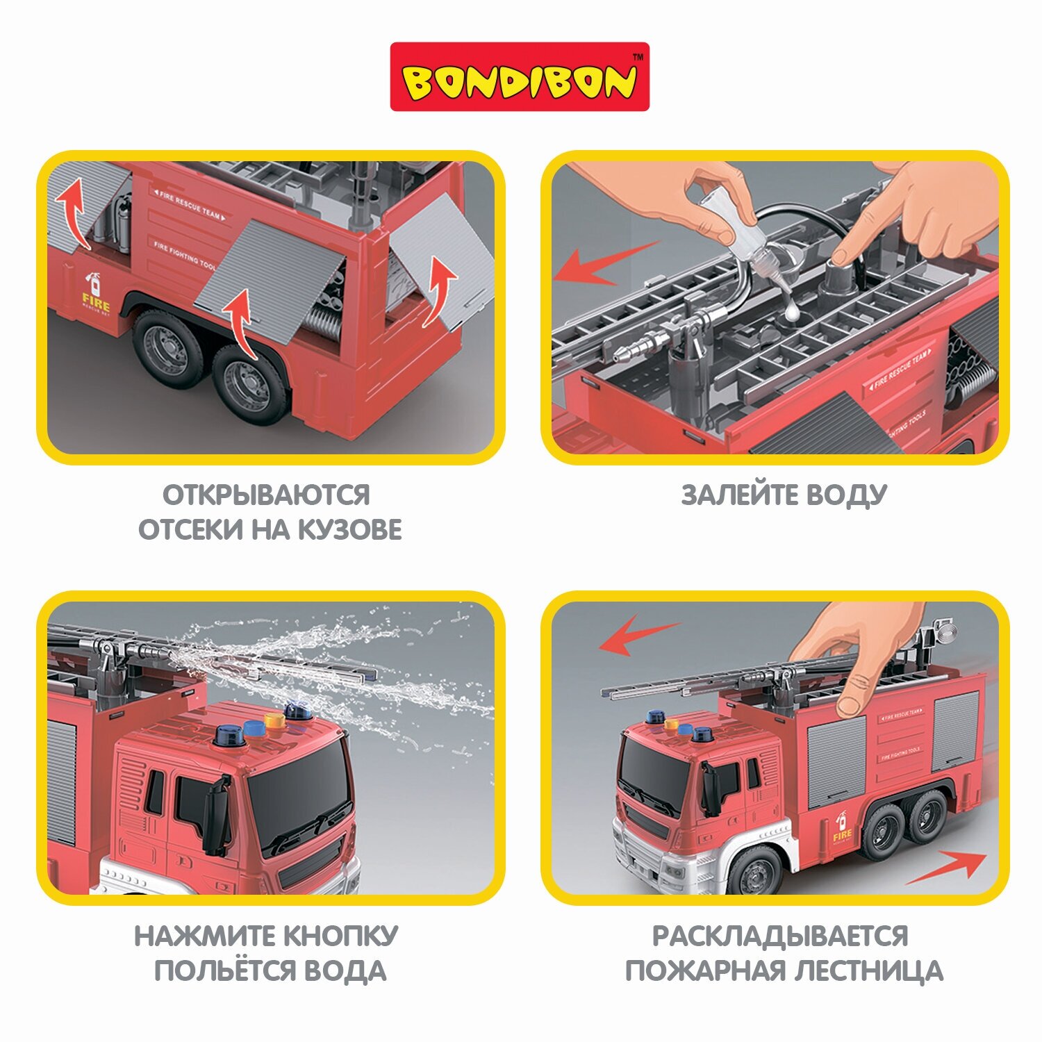 Зато пожарная машина от Bondibon - отличная игрушка для мальчиков и девочек! У нее раскладывается пожарная лестница, открываются отсеки двери на кузове. Детская машинка водовоз поливает водой из шланга. Залейте воду в резервуар и нажмите на кнопку - из шланга польётся вода.