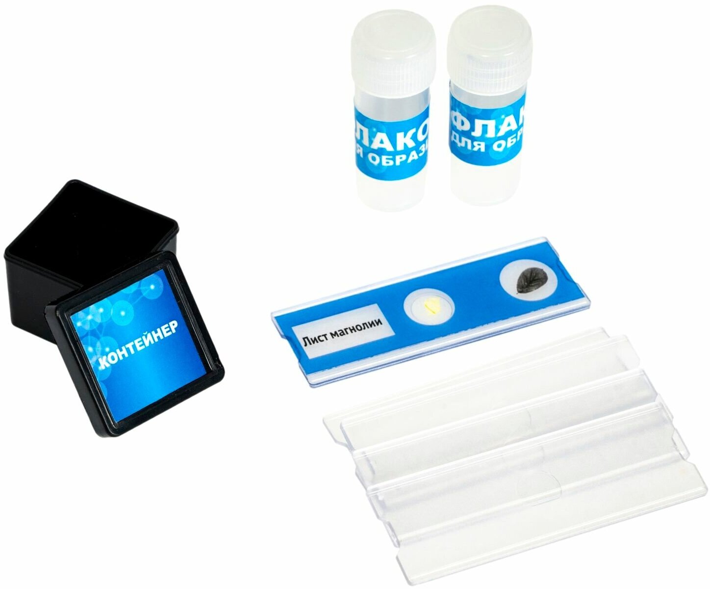 В набор входят 4 пустых слайда для образцов, слайд с готовым образцом, контейнер, флаконы для образцов, пинцет и инструкция. Для детской электроники потребуются 2 батарейки А