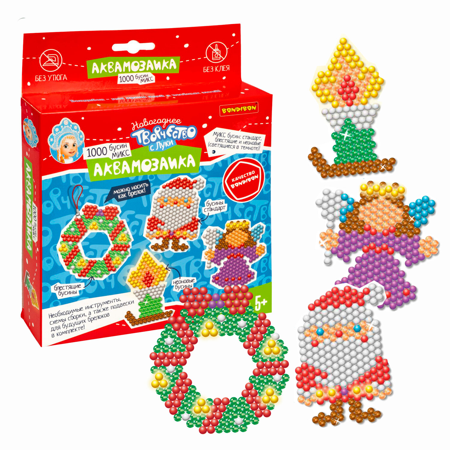 1000 бусин в милом наборе для творчества Аквамозаика "Ангел, Санта, Венок, Свеча" от Bondibon.