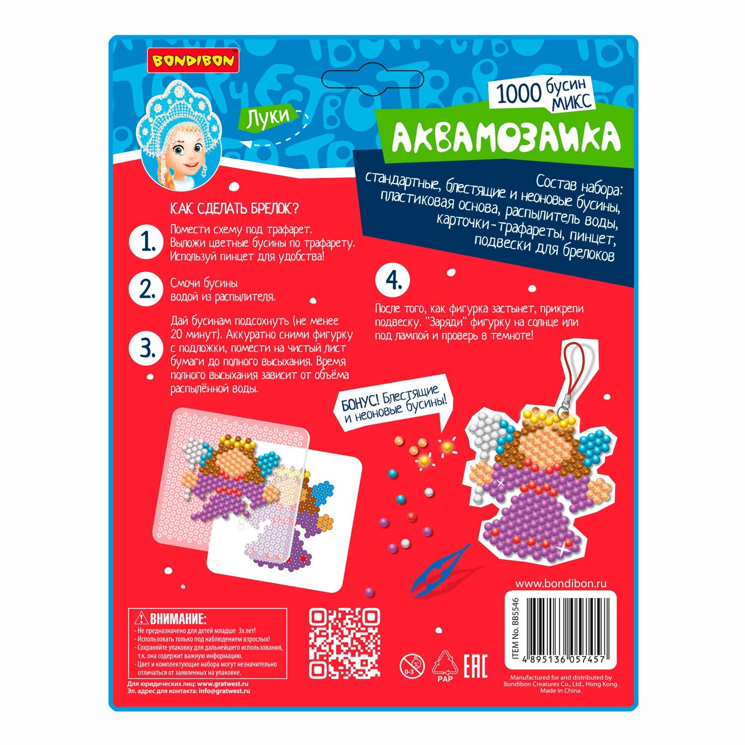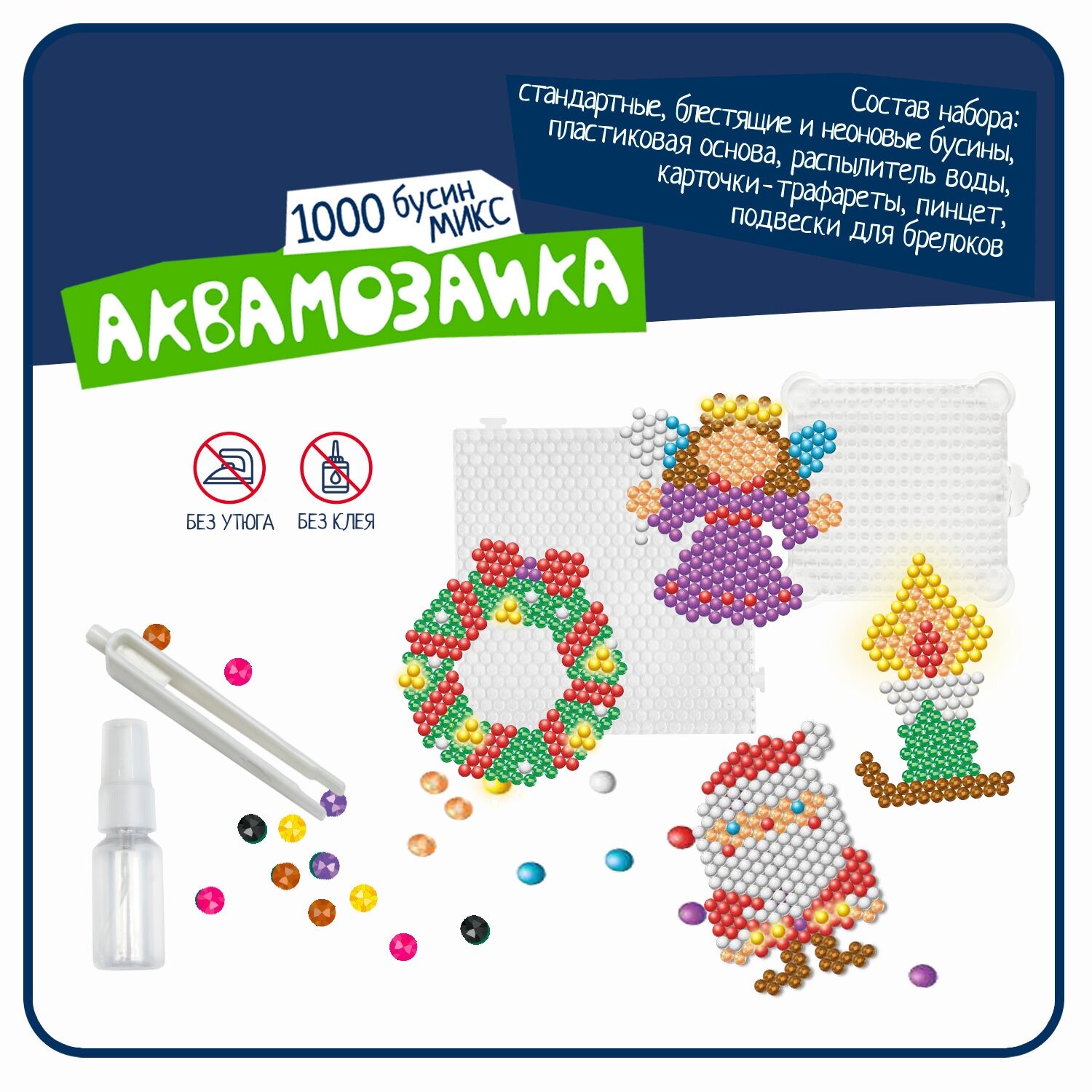 В комплекте: 1000 микс бусин - стандарт, блестящие и неоновые (светятся в темноте); пластиковая основа; распылитель воды; 4 карточки-трафарета; пинцет и подвески для брелоков. Возраст 5+