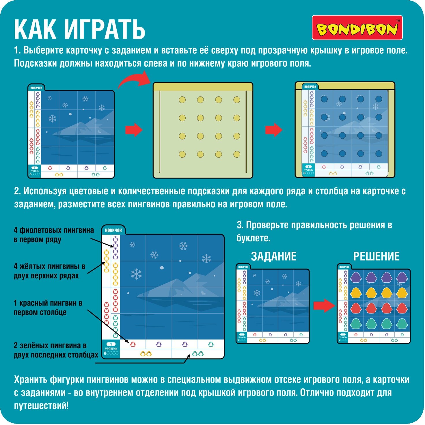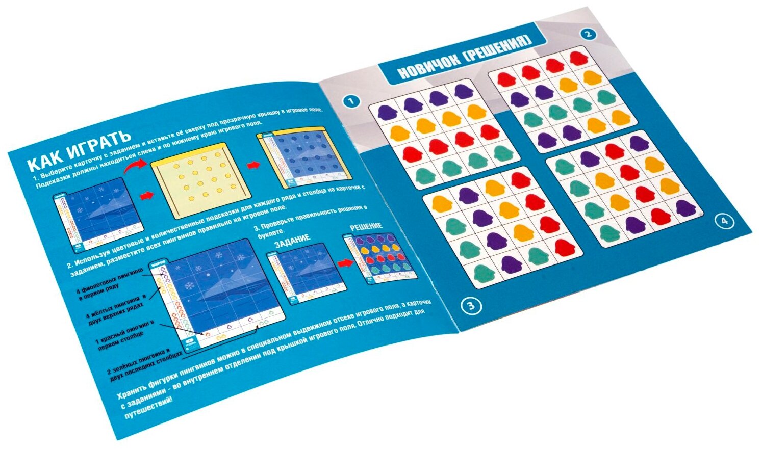 | Комплектация | игровое поле; фигурки пингвинов 4 цветов- 16 шт.; двухсторонние карточки с заданиями - 20 шт.; буклет с правилами игры и решениями |